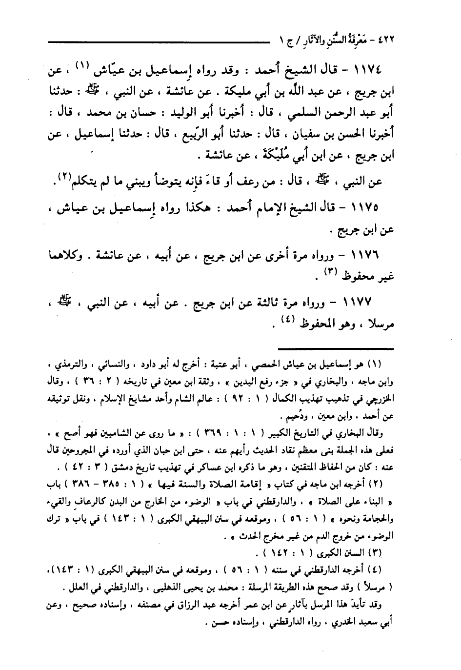 1174 - قَالَ الشَّيْخُ أَحْمَدُ: وَقَدْ رَوَاهُ إِسْمَاعِيلُ بْنُ عَيَّاشٍ، عَنِ ابْنِ جُرَيْجٍ، عَنْ عَبْدِ اللَّهِ بْنِ أَبِي مُلَيْكَةِ، عَنْ عَائِشَةَ، عَنِ النَّبِيِّ صَلَّى اللهُ عَلَيْهِ وَسَلَّمَ: حَدَّثَنَا أَبُو عَبْدِ الرَّحْمَنِ السُّلَمِيُّ قَالَ: أَخْبَرَنَا أَبُو الْوَلِيدِ حَسَّانُ بْنُ مُحَمَّدٍ قَالَ: أَخْبَرَنَا الْحَسَنُ بْنُ سُفْيَانَ قَالَ: حَدَّثَنَا أَبُو الرَّبِيعِ قَالَ: حَدَّثَنَا إِسْمَاعِيلُ، عَنِ ابْنِ جُرَيْجٍ، عَنِ ابْنِ أَبِي مُلَيْكَةَ، عَنْ عَائِشَةَ، عَنِ النَّبِيِّ صَلَّى اللهُ عَلَيْهِ وَسَلَّمَ قَالَ: «§مَنْ رَعَفَ، أَوْ قَاءَ فَإِنَّهُ يَتَوَضَّأُ وَيَبْنِي، مَا لَمْ يَتَكَلَّمْ»