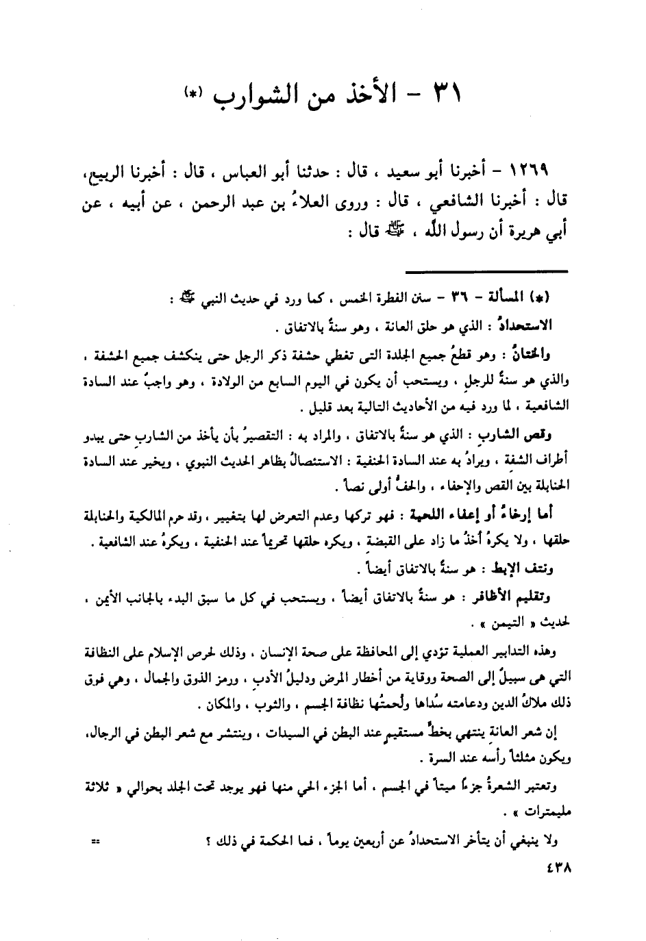 1269 - أَخْبَرَنَا أَبُو سَعِيدٍ قَالَ: حَدَّثَنَا أَبُو الْعَبَّاسِ قَالَ: أَخْبَرَنَا الرَّبِيعُ قَالَ: أَخْبَرَنَا الشَّافِعِيُّ قَالَ: وَرَوَى الْعَلَاءُ بْنُ عَبْدِ الرَّحْمَنِ، عَنْ أَبِيهِ، عَنْ أَبِي هُرَيْرَةَ: أَنَّ رَسُولَ اللَّهِ صَلَّى اللهُ عَلَيْهِ وَسَلَّمَ قَالَ -[439]-: «§أَعْفُوا اللِّحَى وَخُذُوا مِنَ الشَّوَارِبِ، وَغَيِّرُوا الشَّيْبَ، وَلَا تَشَبَّهُوا بِالْيَهُودِ».