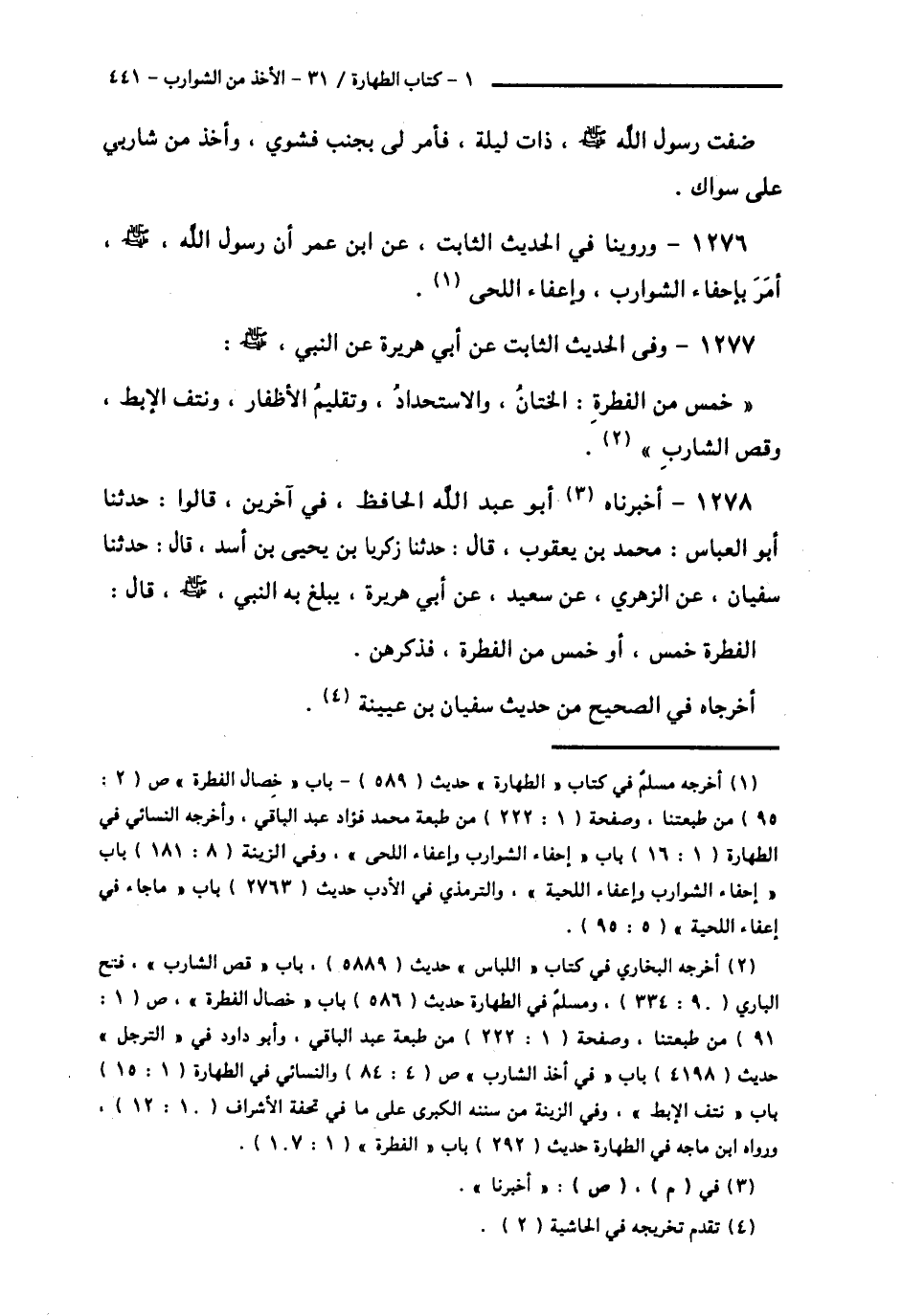 1277 - وَفِي الْحَدِيثِ الثَّابِتِ عَنْ أَبِي هُرَيْرَةَ، عَنِ النَّبِيِّ صَلَّى اللهُ عَلَيْهِ وَسَلَّمَ: §" خَمْسٌ مِنَ الْفِطْرَةِ: الْخِتَانُ، وَالِاسْتِحْدَادُ، وَتَقْلِيمُ الْأَظْفَارِ، وَنَتْفُ الْإِبْطِ، وَقَصُّ الشَّارِبِ "،