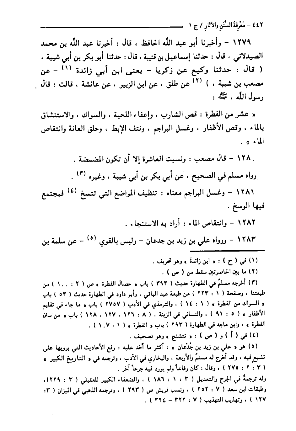 1279 - وَأَخْبَرَنَا أَبُو عَبْدِ اللَّهِ الْحَافِظُ قَالَ: أَخْبَرَنَا عَبْدُ اللَّهِ بْنُ مُحَمَّدٍ الصَّيْدَلَانِيُّ قَالَ: حَدَّثَنَا إِسْمَاعِيلُ بْنُ قُتَيْبَةَ قَالَ: حَدَّثَنَا أَبُو بَكْرِ بْنُ أَبِي شَيْبَةَ قَالَ: حَدَّثَنَا وَكِيعٌ، عَنْ زَكَرِيَّا يَعْنِي ابْنَ أَبِي زَائِدَةَ، عَنْ مُصْعَبِ بْنِ شَيْبَةَ، عَنْ طَلْقٍ، عَنِ ابْنِ الزُّبَيْرِ، عَنْ عَائِشَةَ قَالَتْ: قَالَ رَسُولُ اللَّهِ صَلَّى اللهُ عَلَيْهِ وَسَلَّمَ: " §عَشْرٌ مِنَ الْفِطْرَةِ: قَصُّ الشَّارِبِ، وَإِعْفَاءُ اللِّحْيَةِ، وَالسِّوَاكُ، وَالِاسْتِنْشَاقُ بِالْمَاءِ، وَقَصُّ الْأَظْفَارِ، وَغَسْلُ الْبَرَاجِمِ، وَنَتْفُ الْإِبْطِ، وَحَلْقُ الْعَانَةِ، وَانْتِقَاصُ الْمَاءِ ".