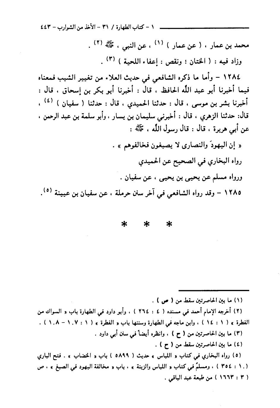 1284 - وَأَمَّا مَا ذَكَرَهُ الشَّافِعِيُّ فِي حَدِيثِ الْعَلَاءِ مِنْ تَغْيِيرِ الشَّيْبِ، فَمَعْنَاهُ فِيمَا أَخْبَرَنَا أَبُو عَبْدِ اللَّهِ الْحَافِظُ قَالَ: أَخْبَرَنَا أَبُو بَكْرِ بْنُ إِسْحَاقَ قَالَ: أَخْبَرَنَا بِشْرُ بْنُ مُوسَى قَالَ: حَدَّثَنَا الْحُمَيْدِيُّ قَالَ: حَدَّثَنَا سُفْيَانُ قَالَ: حَدَّثَنَا الزُّهْرِيُّ قَالَ: أَخْبَرَنِي سُلَيْمَانُ بْنُ يَسَارٍ، وَأَبُو سَلَمَةَ بْنُ عَبْدِ الرَّحْمَنِ، عَنْ أَبِي هُرَيْرَةَ قَالَ: قَالَ رَسُولُ اللَّهِ صَلَّى اللهُ عَلَيْهِ وَسَلَّمَ: «إِنَّ §الْيَهُودَ وَالنَّصَارَى لَا يَصْبُغُونَ فَخَالِفُوهُمْ». رَوَاهُ الْبُخَارِيُّ فِي الصَّحِيحِ، عَنِ الْحُمَيْدِيِّ، وَرَوَاهُ مُسْلِمٌ، عَنْ يَحْيَى بْنِ يَحْيَى، عَنْ سُفْيَانَ.