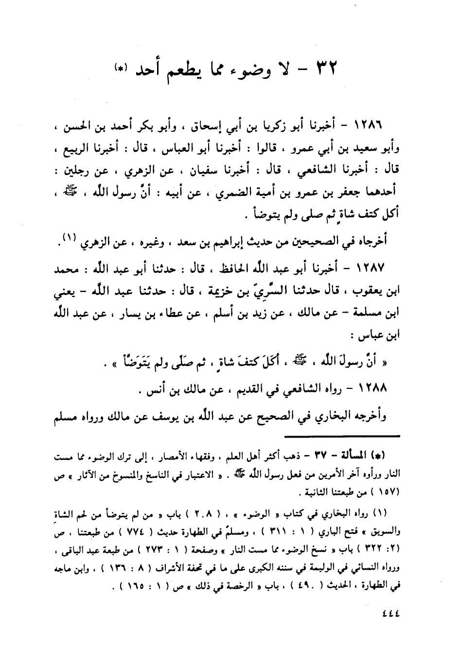1287 - أَخْبَرَنَا أَبُو عَبْدِ اللَّهِ الْحَافِظُ قَالَ: حَدَّثَنَا أَبُو عَبْدِ اللَّهِ مُحَمَّدُ بْنُ يَعْقُوبَ قَالَ: حَدَّثَنَا السَّرِيُّ بْنُ خُزَيْمَةَ قَالَ: حَدَّثَنَا عَبْدُ اللَّهِ يَعْنِي ابْنَ مَسْلَمَةَ، عَنْ مَالِكٍ، عَنْ زَيْدِ بْنِ أَسْلَمَ، عَنْ عَطَاءِ بْنِ يَسَارٍ، عَنْ عَبْدِ اللَّهِ بَنِ عَبَّاسٍ: «أَنَّ رَسُولَ اللَّهِ صَلَّى اللهُ عَلَيْهِ وَسَلَّمَ §أَكَلَ كَتِفَ شَاةٍ ثُمَّ صَلَّى وَلَمْ يَتَوَضَّأْ».