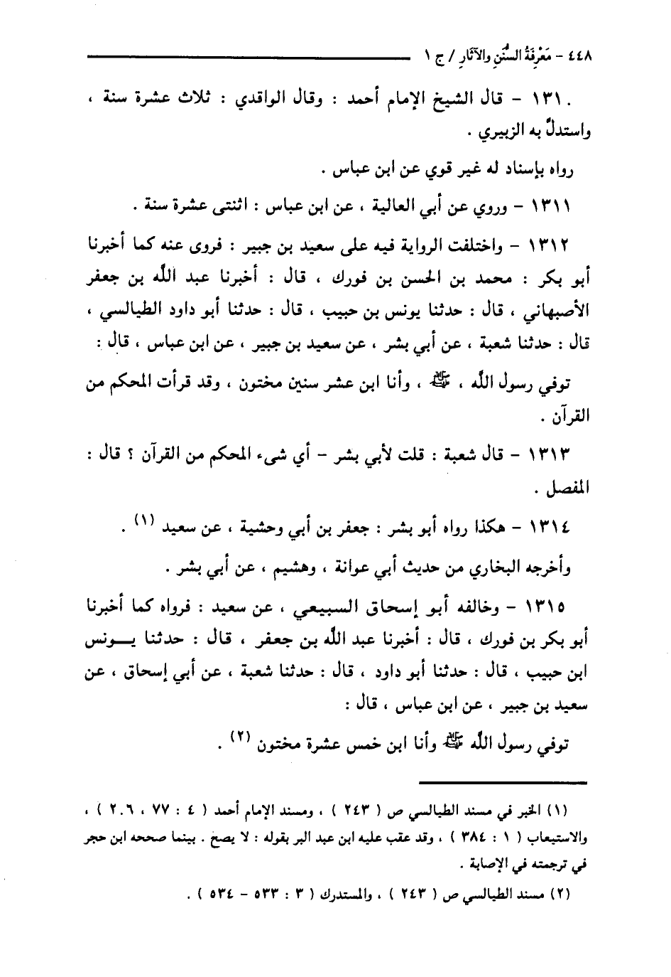 1312 - وَاخْتَلَفَتِ الرِّوَايَةُ فِيهِ عَلَى سَعِيدِ بْنِ جُبَيْرٍ: فَرَوَى عَنْهُ، كَمَا أَخْبَرَنَا أَبُو بَكْرٍ مُحَمَّدُ بْنُ الْحَسَنِ بْنِ فُورَكٍ قَالَ: أَخْبَرَنَا عَبْدُ اللَّهِ بْنُ جَعْفَرٍ الْأَصْبَهَانِيُّ قَالَ: حَدَّثَنَا يُونُسُ بْنُ حَبِيبٍ قَالَ: حَدَّثَنَا أَبُو دَاوُدَ الطَّيَالِسِيُّ قَالَ: حَدَّثَنَا شُعْبَةُ، عَنْ أَبِي بِشْرٍ، عَنْ سَعِيدِ بْنِ جُبَيْرٍ، عَنِ ابْنِ عَبَّاسٍ قَالَ: § «تُوُفِّيَ رَسُولُ اللَّهِ صَلَّى اللهُ عَلَيْهِ وَسَلَّمَ وَأَنَا ابْنُ عَشْرِ سِنِينَ مَخْتُونٌ، وَقَدْ قَرَأْتُ الْمُحْكَمَ مِنَ الْقُرْآنِ».