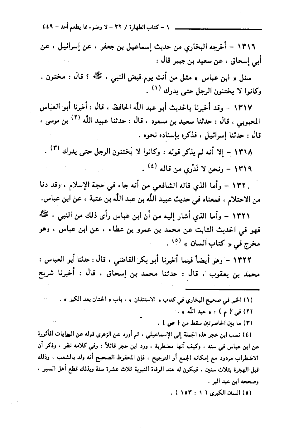 1316 - أَخْرَجَهُ الْبُخَارِيُّ مِنْ حَدِيثِ إِسْمَاعِيلَ بْنِ جَعْفَرٍ، عَنْ إِسْرَائِيلَ، عَنْ أَبِي إِسْحَاقَ، عَنْ سَعِيدِ بْنِ جُبَيْرٍ قَالَ: سُئِلَ ابْنُ عَبَّاسٍ: §مِثْلُ مَنْ أَنْتَ يَوْمَ قُبِضَ النَّبِيُّ صَلَّى اللهُ عَلَيْهِ وَسَلَّمَ؟ قَالَ: «مَخْتُونٌ»، وَكَانُوا لَا يَخْتِنُونَ الرَّجُلَ حَتَّى يُدْرِكَ.