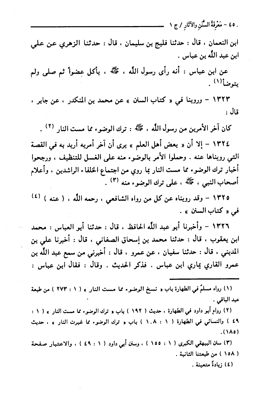 1326 - وَأَخْبَرَنَا أَبُو عَبْدِ اللَّهِ الْحَافِظُ قَالَ: حَدَّثَنَا أَبُو الْعَبَّاسِ مُحَمَّدُ بْنُ يَعْقُوبَ قَالَ: حَدَّثَنَا مُحَمَّدُ بْنُ إِسْحَاقَ الصَّغَانِيُّ قَالَ: أَخْبَرَنَا عَلِيُّ بْنُ الْمَدِينِيِّ قَالَ: حَدَّثَنَا سُفْيَانُ، عَنْ عَمْرٍو، قَالَ: أَخْبَرَنِي مَنْ، سَمِعَ عَبْدَ اللَّهِ بْنَ عَمْرٍو الْقَارِي، يُمَارِي ابْنَ عَبَّاسٍ. فَذَكَرَ الْحَدِيثَ. وَقَالَ: فَقَالَ ابْنُ عَبَّاسٍ -[451]-: «أَنَتَوَضَّأُ مِنَ الدُّهْنِ؟ أَنَتَوَضَّأُ مِنَ الْحَمِيمِ؟ وَاللَّهُ §مَا أَحَلَّتِ النَّارُ شَيْئًا وَلَا حَرَّمَتْهُ»