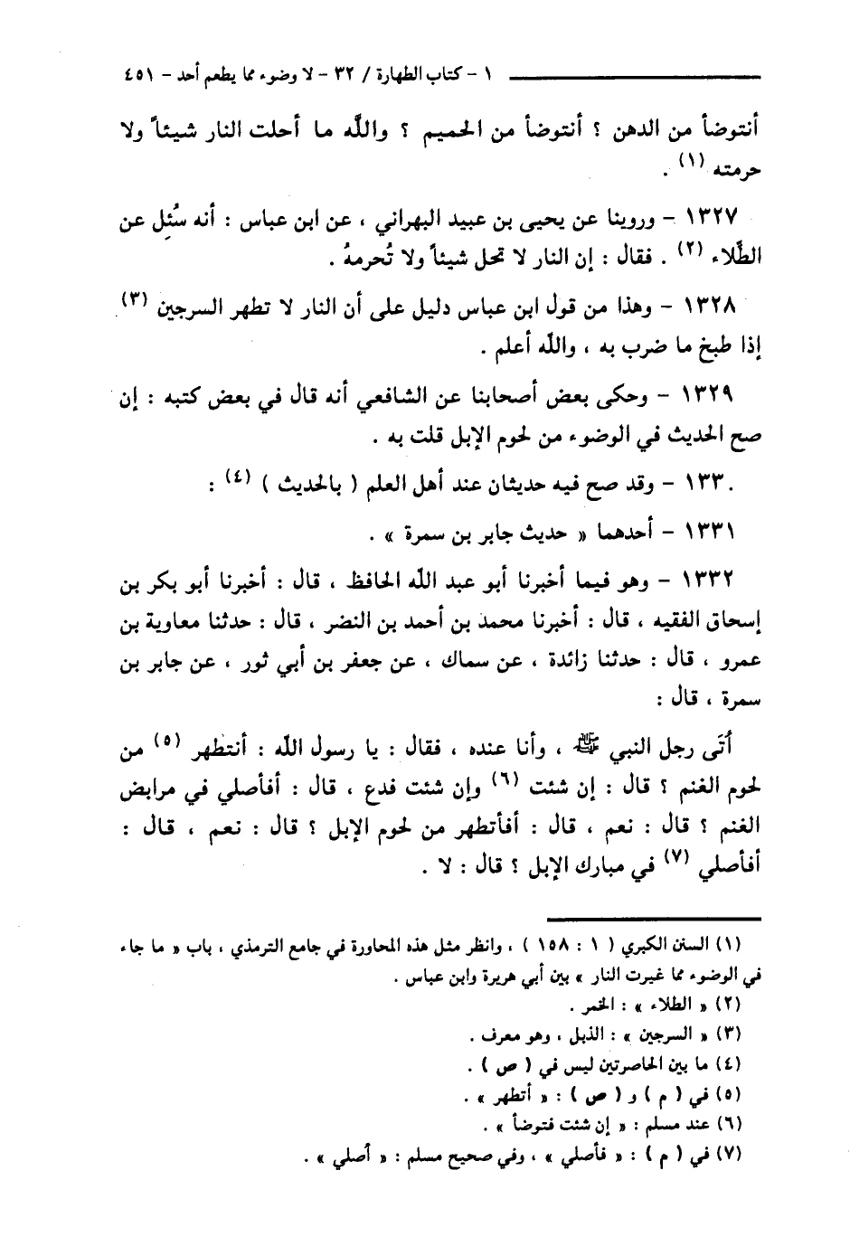 1333 - رَوَاهُ مُسْلِمٌ فِي الصَّحِيحِ، عَنْ أَبِي كَامِلٍ الْجَحْدَرِيِّ، عَنْ أَبِي عَوَانَةَ، عَنْ عُثْمَانَ بْنِ عَبْدِ اللَّهِ بْنِ مَوْهَبٍ، عَنْ جَعْفَرِ بْنِ أَبِي ثَوْرٍ، عَنْ جَابِرِ بْنِ سَمُرَةَ: أَنَّ رَجُلًا سَأَلَ رَسُولَ اللَّهِ صَلَّى اللهُ عَلَيْهِ وَسَلَّمَ فَذَكَرَ مَعْنَاهُ، وَقَالَ فِيهِ: أَتَوَضَّأُ مِنْ لُحُومِ الْإِبِلِ؟ قَالَ: «نَعَمْ». فَتَوَضَّأَ مِنْ لُحُومِ الْإِبِلِ.