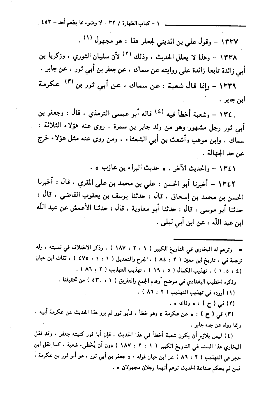 1342 - أَخْبَرَنَا أَبُو الْحَسَنِ عَلِيُّ بْنُ مُحَمَّدِ بْنِ عَلِيٍّ الْمُقْرِئُ قَالَ: أَخْبَرَنَا الْحَسَنُ بْنُ مُحَمَّدِ بْنِ إِسْحَاقَ قَالَ: حَدَّثَنَا يُوسُفُ بْنُ يَعْقُوبَ الْقَاضِي قَالَ: حَدَّثَنَا أَبُو مُوسَى قَالَ: حَدَّثَنَا أَبُو مُعَاوِيَةَ قَالَ: حَدَّثَنَا الْأَعْمَشُ، عَنْ عَبْدِ اللَّهِ بْنِ عَبْدِ اللَّهِ، عَنِ ابْنِ أَبِي لَيْلَى -[454]-، عَنِ الْبَرَاءِ بْنِ عَازِبٍ قَالَ: سُئِلَ النَّبِيُّ صَلَّى اللهُ عَلَيْهِ وَسَلَّمَ عَنِ §الْوُضُوءِ مِنْ لُحُومِ الْإِبِلِ؟ فَقَالَ: «تَوَضَّئُوا مِنْهَا»، وَسُئِلُ عَنِ الْوُضُوءِ مِنْ لُحُومِ الْغَنَمِ؟ قَالَ: «لَا تَوَضَّئُوا مِنْهَا»، أَخْرَجَهُ أَبُو دَاوُدَ فِي كِتَابِ السُّنَنِ، عَنْ عُثْمَانَ بْنِ أَبِي شَيْبَةَ، عَنْ أَبِي مُعَاوِيَةَ.