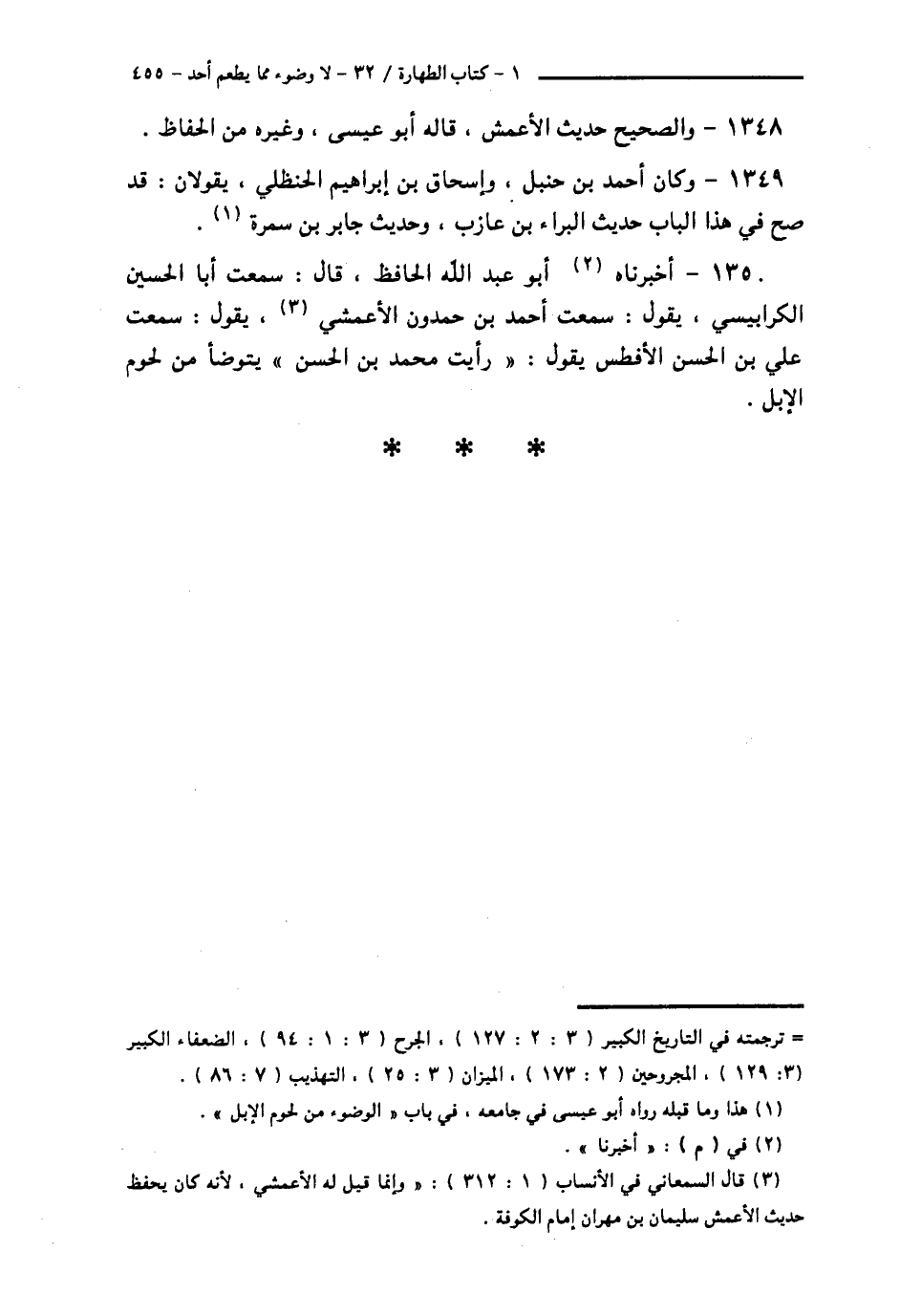 1350 - أَخْبَرَنَاهُ أَبُو عَبْدِ اللَّهِ الْحَافِظُ قَالَ: سَمِعْتُ أَبَا الْحُسَيْنِ الْكَرَابِيسِيَّ، يَقُولُ: سَمِعْتُ أَحْمَدَ بْنَ حَمْدُونَ الْأَعْمَشِيَّ، يَقُولُ: سَمِعْتُ عَلِيَّ بْنَ الْحَسَنِ الْأَفْطَسَ، يَقُولُ: «رَأَيْتُ مُحَمَّدَ بْنَ الْحَسَنِ §يَتَوَضَّأُ مِنْ لُحُومِ الْإِبِلِ»