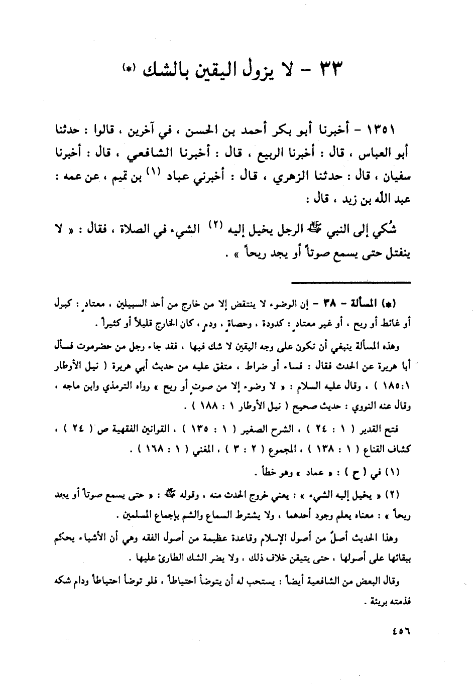 1351 - أَخْبَرَنَا أَبُو بَكْرٍ أَحْمَدُ بْنُ الْحَسَنِ فِي آخَرِينَ، قَالُوا: حَدَّثَنَا أَبُو الْعَبَّاسِ قَالَ: أَخْبَرَنَا الرَّبِيعُ قَالَ: أَخْبَرَنَا الشَّافِعِيُّ قَالَ: أَخْبَرَنَا سُفْيَانُ قَالَ: حَدَّثَنَا الزُّهْرِيُّ قَالَ: أَخْبَرَنِي عَبَّادُ بْنُ تَمِيمٍ، عَنْ عَمِّهِ عَبْدِ اللَّهِ بْنِ زَيْدٍ قَالَ: شُكِيَ إِلَى النَّبِيِّ صَلَّى اللهُ عَلَيْهِ وَسَلَّمَ الرَّجُلُ يُخَيَّلُ إِلَيْهِ الشَّيْءُ فِي الصَّلَاةِ، فَقَالَ: «§لَا يَنْفَتِلُ حَتَّى يَسْمَعَ صَوْتًا أَوْ يَجِدَ رِيحًا» -[457]-، أَخْرَجَاهُ فِي الصَّحِيحِ كَمَا مَضَى