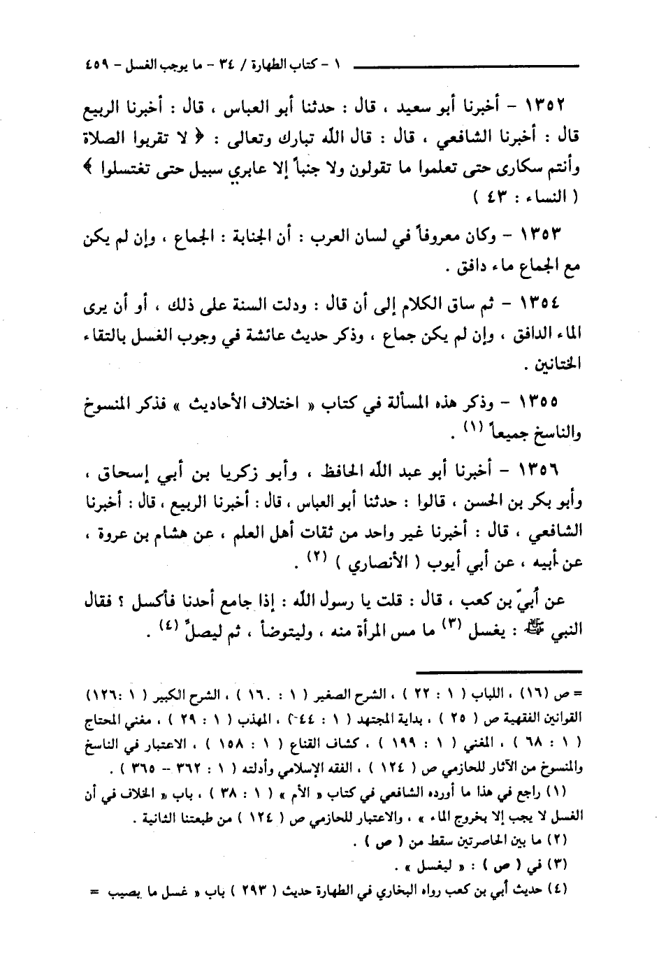 1356 - أَخْبَرَنَا أَبُو عَبْدِ اللَّهِ الْحَافِظُ، وَأَبُو زَكَرِيَّا بْنُ أَبِي إِسْحَاقَ، وَأَبُو بَكْرِ بْنُ الْحَسَنِ، قَالُوا: حَدَّثَنَا أَبُو الْعَبَّاسِ قَالَ: أَخْبَرَنَا الرَّبِيعُ قَالَ: أَخْبَرَنَا الشَّافِعِيُّ قَالَ: أَخْبَرَنَا غَيْرُ وَاحِدٍ مِنْ ثِقَاتِ أَهْلِ الْعِلْمِ، عَنْ هِشَامِ بْنِ عُرْوَةَ، عَنْ أَبِيهِ، عَنْ أَبِي أَيُّوبَ الْأَنْصَارِيِّ، عَنْ أُبَيِّ بْنِ كَعْبٍ قَالَ: قُلْتُ: يَا رَسُولَ اللَّهِ §إِذَا جَامَعَ أَحَدُنَا فَأَكْسَلَ؟ فَقَالَ النَّبِيُّ صَلَّى اللهُ عَلَيْهِ وَسَلَّمَ: «يَغْسِلُ مَا مَسَّ الْمَرْأَةَ مِنْهُ، وَلْيَتَوَضَّأْ، ثُمَّ لِيصَلِّ» -[460]-