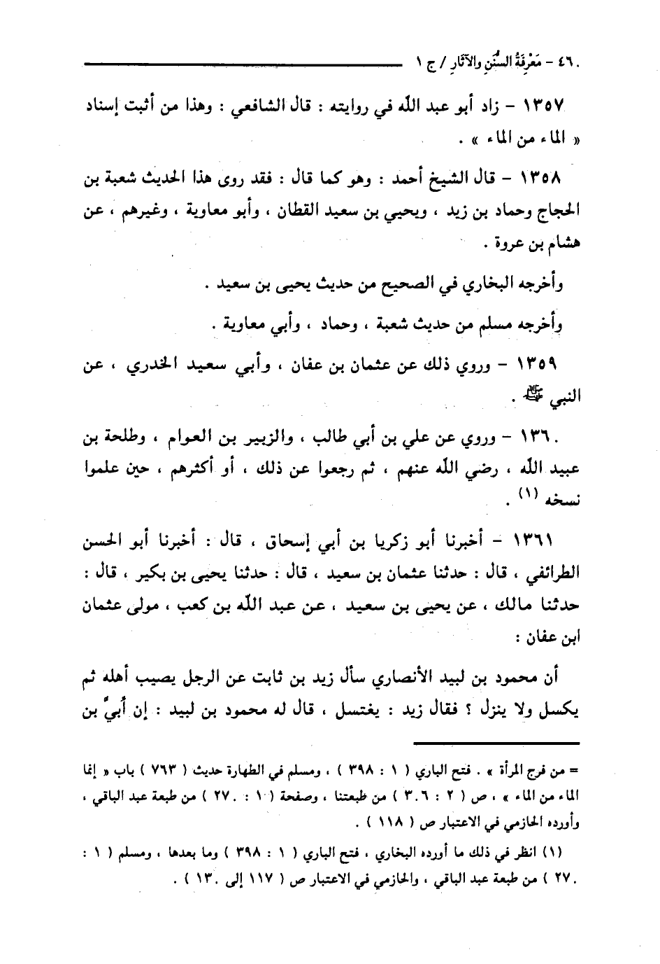 1361 - أَخْبَرَنَا أَبُو زَكَرِيَّا بْنُ أَبِي إِسْحَاقَ قَالَ: أَخْبَرَنَا أَبُو الْحَسَنِ الطَّرَائِفِيُّ قَالَ: حَدَّثَنَا عُثْمَانُ بْنُ سَعِيدٍ قَالَ: حَدَّثَنَا يَحْيَى بْنُ بُكَيْرٍ قَالَ: حَدَّثَنَا مَالِكٌ، عَنْ يَحْيَى بْنِ سَعِيدٍ، عَنْ عَبْدِ اللَّهِ بْنِ كَعْبٍ، مَوْلَى عُثْمَانَ بْنِ عَفَّانَ: أَنَّ مَحْمُودَ بْنَ لَبِيدٍ الْأَنْصَارِيَّ، سَأَلَ زَيْدَ بْنَ ثَابِتٍ: عَنِ §الرَّجُلِ يُصِيبُ أَهْلَهُ ثُمَّ يُكْسِلُ وَلَا يُنْزِلُ؟ فَقَالَ زَيْدٌ: «يَغْتَسِلُ» قَالَ لَهُ مَحْمُودُ بْنُ لَبِيدٍ: إِنَّ أُبَيَّ بْنَ -[461]- كَعْبٍ كَانَ لَا يَرَى الْغُسْلَ، فَقَالَ لَهُ زَيْدُ بْنُ ثَابِتٍ: «إِنَّ أُبَيًّا نَزَعَ عَنْ ذَلِكَ قَبْلَ أَنْ يَمُوتَ».