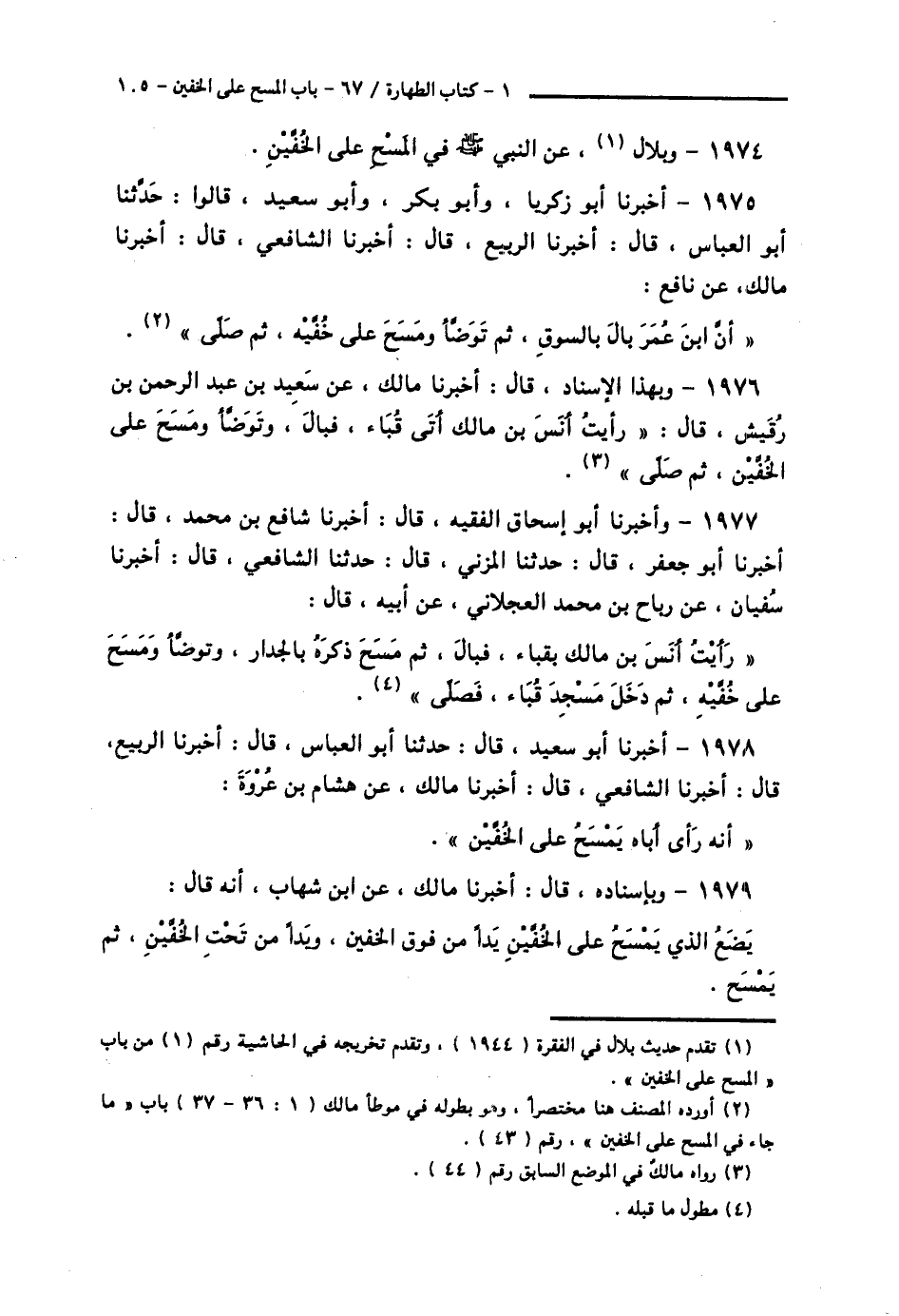 1979 - وَبِإِسْنَادِهِ قَالَ: أَخْبَرَنَا مَالِكٌ، عَنِ ابْنِ شِهَابٍ، أَنَّهُ قَالَ: §يَضَعُ الَّذِي يَمْسَحُ عَلَى الْخُفَّيْنِ يَدًا مِنْ فَوْقِ الْخُفَّيْنِ , وَيَدًا مِنْ تَحْتِ الْخُفَّيْنِ , ثُمَّ يَمْسَحُ " -[106]-