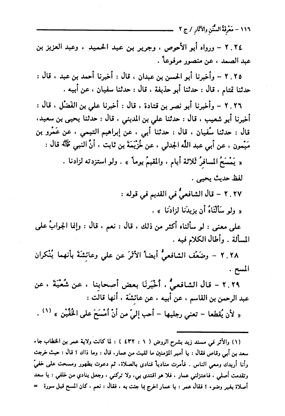 2028 - وَضَعَّفَ الشَّافِعِيُّ أَيْضًا الْأَثَرَ عَنْ عَلِيٍّ، وَعَائِشَةَ، بِأَنَّهُمَا يُنْكِرَانِ الْمَسْحَ