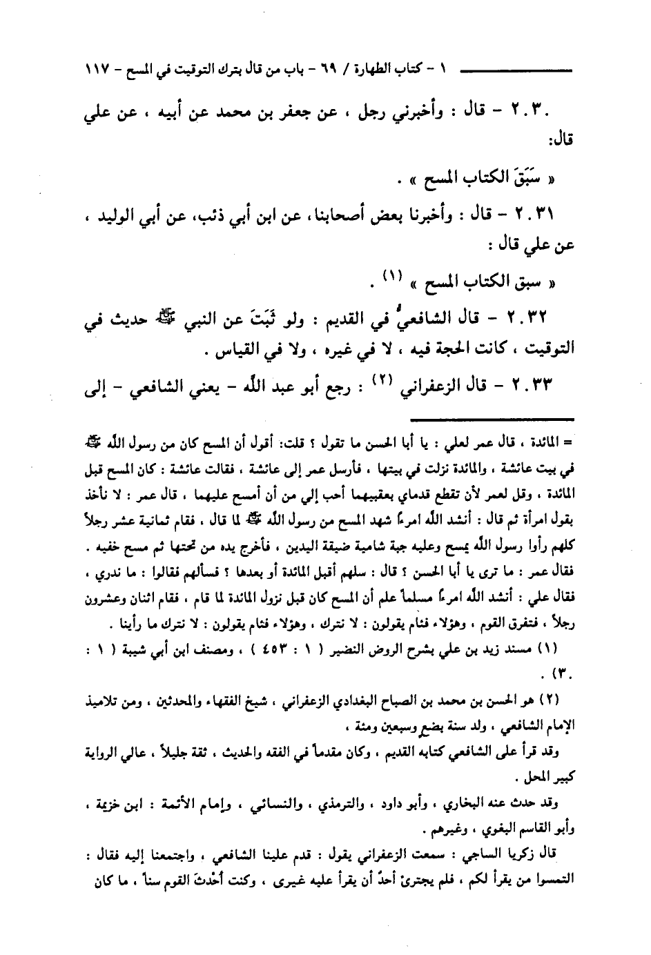 2033 - قَالَ الزَّعْفَرَانِيُّ: رَجَعَ أَبُو عَبْدِ اللَّهِ يَعْنِي الشَّافِعِيَّ إِلَى -[118]- التَّوْقِيتِ فِي الْمَسْحِ لِلْمُقِيمِ يَوْمٌ وَلَيْلَةٌ , وَلِلْمُسَافِرِ ثَلَاثَةُ أَيَّامٍ وَلَيَالِيهِنَّ , عِنْدَنَا بِبَغْدَادَ , قَبْلَ أَنْ يَخْرُجَ مِنْهَا