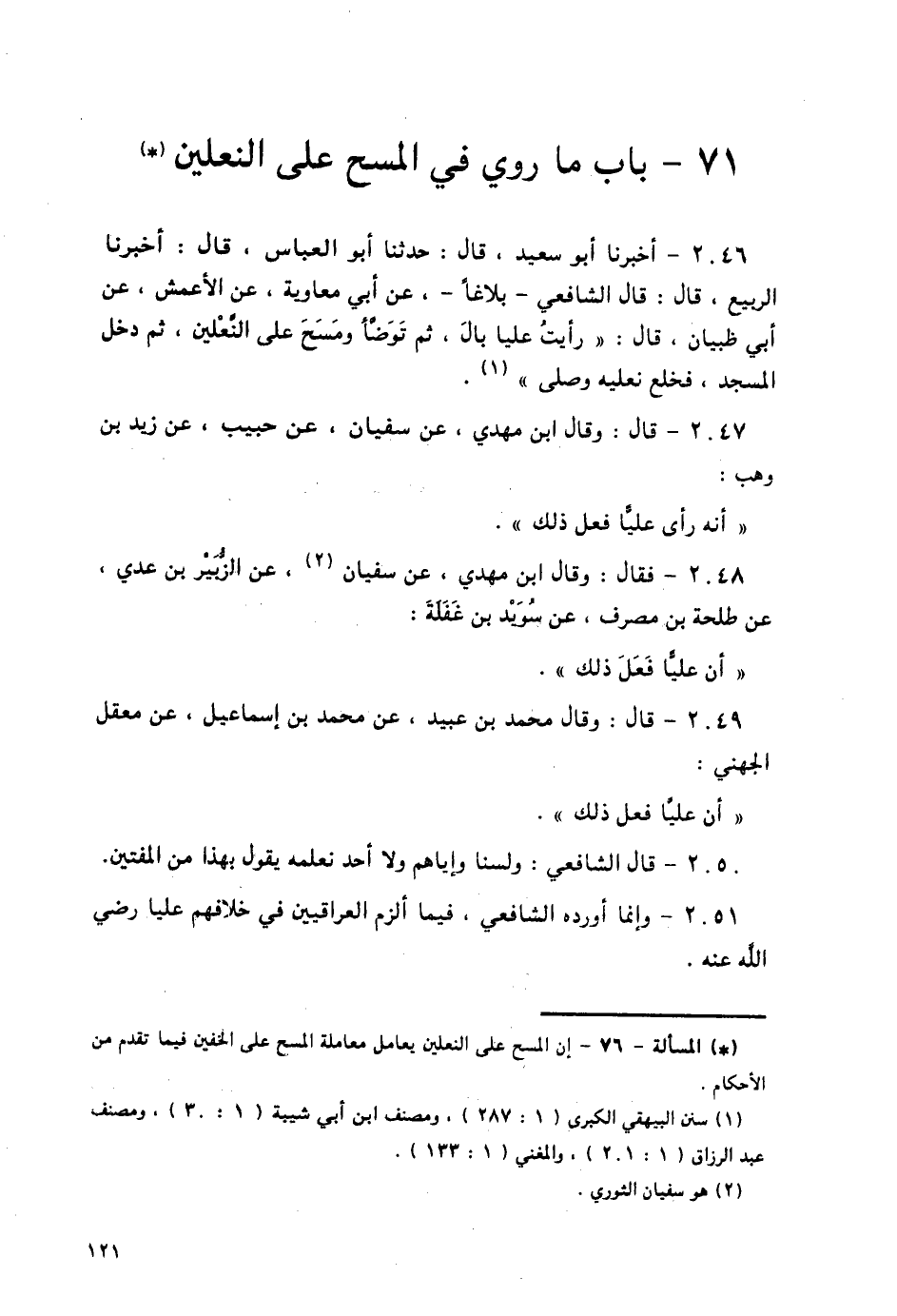 2053 - وَالْأَحَادِيثُ فِي الْمَسْحِ عَلَى النَّعْلَيْنِ , عَلَى أَصْلِهِ مَحْمُولَةٌ عَلَى غَسْلِ الرِّجْلَيْنِ فِيهِمَا، وَالْمَسْحِ عَلَيْهِمَا , كَمَا رُوِّينَا عَنِ ابْنِ عُمَرَ فِي النِّعَالِ السِّبْتِيَّةِ الَّتِي لَيْسَ فِيهَا شَعْرٌ: أَنَّ النَّبِيَّ صَلَّى اللهُ عَلَيْهِ وَسَلَّمَ: «كَانَ يَلْبَسُهَا وَيَتَوَضَّأُ فِيهَا»،