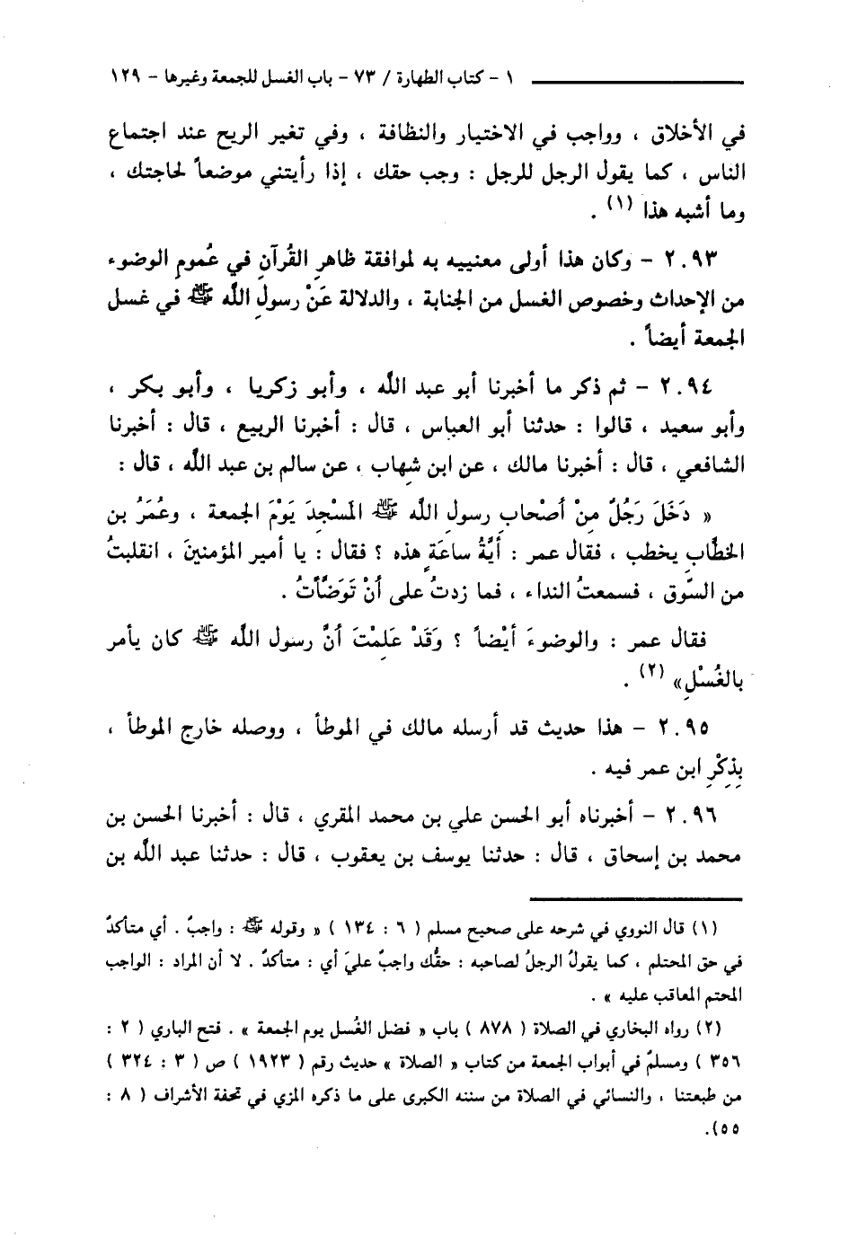 2094 - ثُمَّ ذَكَرَ مَا أَخْبَرَنَا أَبُو عَبْدِ اللَّهِ، وَأَبُو زَكَرِيَّا، وَأَبُو بَكْرٍ , وَأَبُو سَعِيدٍ , قَالُوا: حَدَّثَنَا أَبُو الْعَبَّاسِ قَالَ: أَخْبَرَنَا الرَّبِيعُ قَالَ: أَخْبَرَنَا الشَّافِعِيُّ قَالَ: أَخْبَرَنَا مَالِكٌ، عَنِ ابْنِ شِهَابٍ، عَنْ سَالِمِ بْنِ عَبْدِ اللَّهِ قَالَ: دَخَلَ رَجُلٌ مِنْ أَصْحَابِ رَسُولِ اللَّهِ صَلَّى اللهُ عَلَيْهِ وَسَلَّمَ، الْمَسْجِدَ يَوْمَ الْجُمُعَةِ , وَعُمَرُ بْنُ الْخَطَّابِ يَخْطُبُ , فَقَالَ عُمَرُ: أَيَّةُ سَاعَةٍ هَذِهِ؟ فَقَالَ يَا أَمِيرُ الْمُؤْمِنِينَ , انْقَلَبْتُ مِنَ السُّوقِ , فَسَمِعْتُ النِّدَاءَ , فَمَا زِدْتُ عَلَى أَنْ تَوَضَّأْتُ. فَقَالَ عُمَرُ: وَالْوُضُوءَ أَيْضًا؟ وَقَدْ عَلِمْتَ أَنَّ رَسُولَ اللَّهِ صَلَّى اللهُ عَلَيْهِ وَسَلَّمَ: § «كَانَ يَأْمُرُ بِالْغُسْلِ»