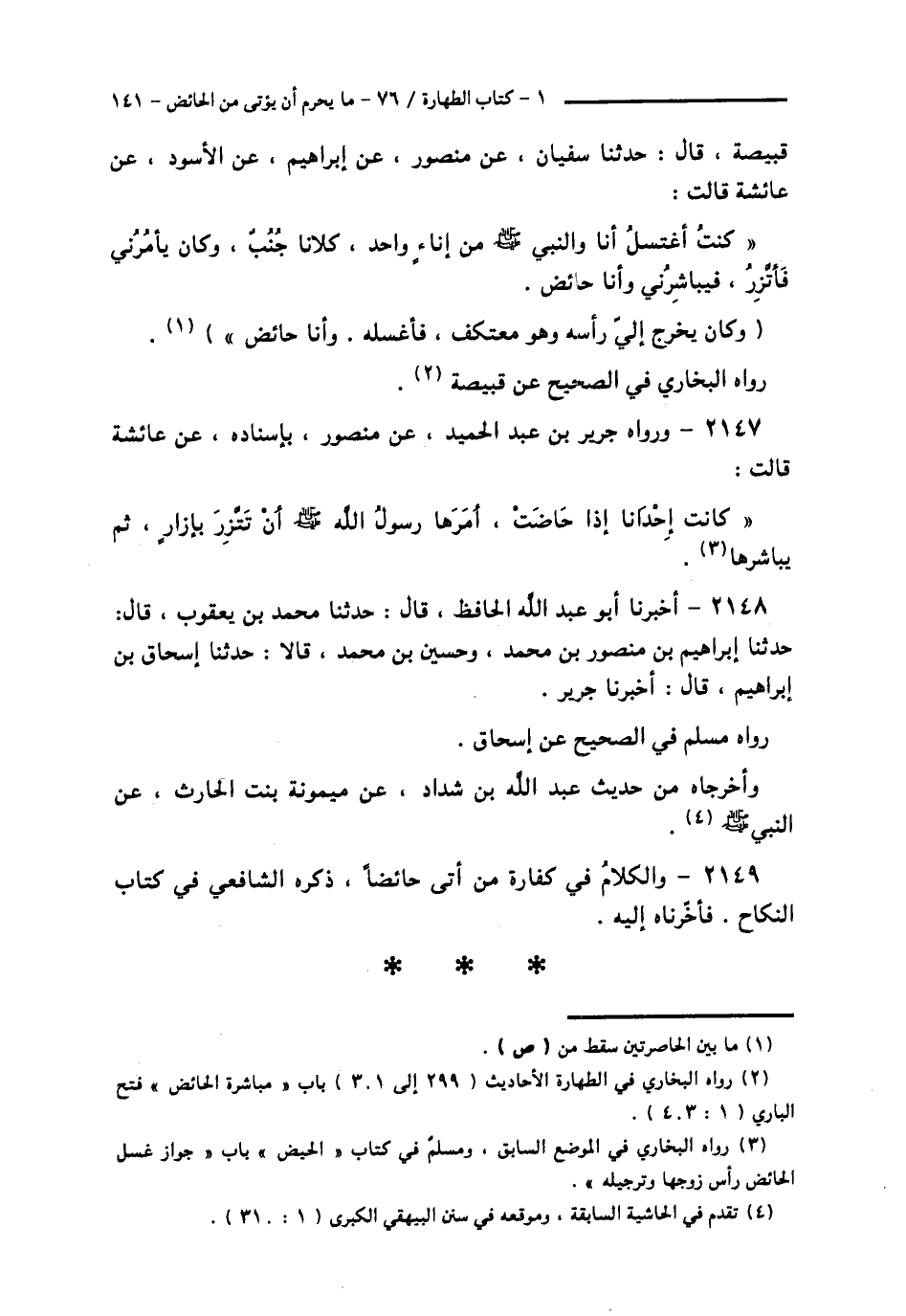 2147 - وَرَوَاهُ جَرِيرُ بْنُ عَبْدِ الْحَمِيدِ , عَنْ مَنْصُورٍ بِإِسْنَادِهِ عَنْ عَائِشَةَ قَالَتْ: § «كَانَتْ إِحْدَانَا إِذَا حَاضَتْ أَمَرَهَا رَسُولُ اللَّهِ صَلَّى اللهُ عَلَيْهِ وَسَلَّمَ أَنْ تَتَّزِرَ بِإِزَارٍ , ثُمَّ يُبَاشِرَهَا»،