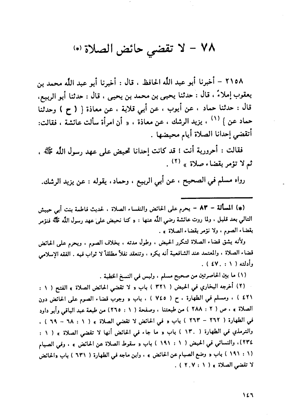 2158 - أَخْبَرَنَا أَبُو عَبْدِ اللَّهِ الْحَافِظُ قَالَ: أَخْبَرَنَا أَبُو عَبْدِ اللَّهِ مُحَمَّدُ بْنُ يَعْقُوبَ إِمْلَاءً , قَالَ حَدَّثَنَا يَحْيَى بْنُ مُحَمَّدِ بْنِ يَحْيَى قَالَ: حَدَّثَنَا أَبُو الرَّبِيعِ قَالَ: حَدَّثَنَا حَمَّادٌ، عَنْ أَيُّوبَ، عَنْ أَبِي قِلَابَةَ، عَنْ مُعَاذَةَ، ح، وَحَدَّثَنَا حَمَّادٌ، عَنْ يَزِيدَ الرِّشْكِ، عَنْ مُعَاذَةَ أَنَّ امْرَأَةً سَأَلَتْ عَائِشَةَ , فَقَالَتْ: أَتَقْضِي إِحْدَانَا الصَّلَاةَ أَيَّامَ مَحِيضِهَا، فَقَالَتْ: «أَحَرُورِيَّةٌ أَنْتِ قَدْ §كَانَتْ إِحْدَانَا تَحِيضُ عَلَى عَهْدِ رَسُولِ اللَّهِ صَلَّى اللهُ عَلَيْهِ وَسَلَّمَ، ثُمَّ لَا تُؤْمَرُ بِقَضَاءِ صَلَاةٍ» رَوَاهُ مُسْلِمٌ فِي الصَّحِيحِ , عَنْ أَبِي الرَّبِيعِ , وَحَمَّادٍ , يَقُولُهُ: عَنْ يَزِيدَ الرِّشْكِ -[147]-.
