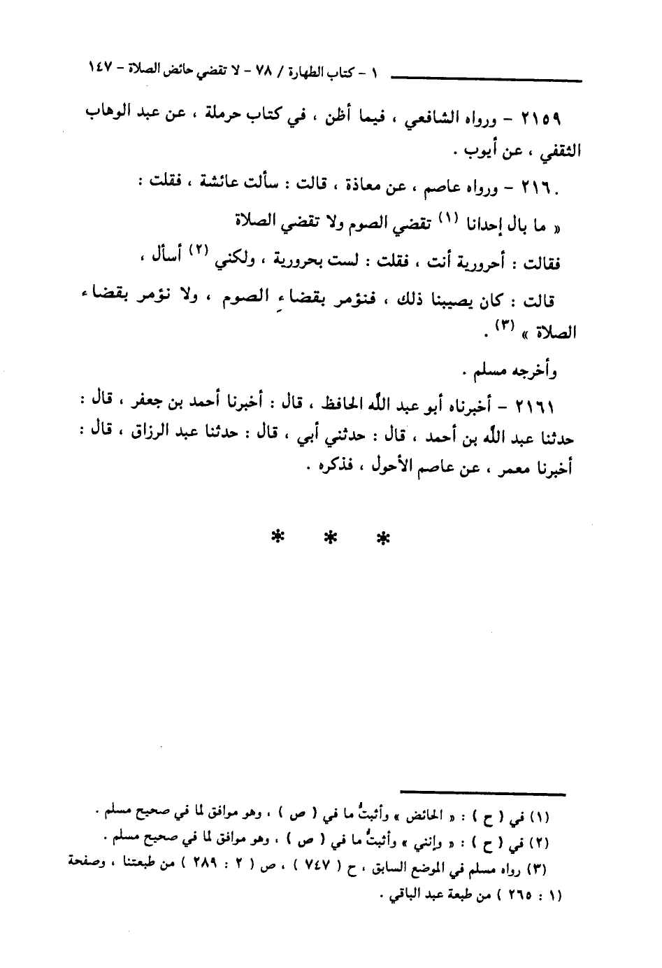2160 - وَرَوَاهُ عَاصِمٌ , عَنْ مُعَاذَةَ قَالَتْ: سَأَلْتُ عَائِشَةَ , فَقُلْتُ: مَا بَالُ إِحْدَانَا تَقْضِي الصَّوْمَ، وَلَا تَقْضِي الصَّلَاةَ؟ فَقَالَتْ: أَحَرُورِيَّةٌ أَنْتِ , فَقُلْتُ: لَسْتُ بِحَرُورِيَّةٍ , وَلَكَنِّي أَسْأَلُ , قَالَتْ: كَانَ §يُصِيبُنَا ذَلِكَ , فَنُؤْمَرُ بِقَضَاءِ الصَّوْمِ , وَلَا نُؤْمَرُ بِقَضَاءِ الصَّلَاةِ " وَأَخْرَجَهُ مُسْلِمٌ.