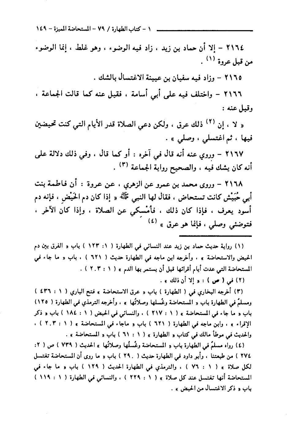 2168 - وَرَوَى مُحَمَّدُ بْنُ عَمْرٍو، عَنِ الزُّهْرِيِّ، عَنْ عُرْوَةَ، أَنَّ فَاطِمَةَ بِنْتَ أَبِي حُبَيْشٍ، كَانَتْ تُسْتَحَاضُ، فَقَالَ لَهَا النَّبِيُّ صَلَّى اللهُ عَلَيْهِ وَسَلَّمَ: § «إِذَا كَانَ دَمُ الْحَيْضِ، فَإِنَّهُ دَمٌ أَسْوَدُ يُعْرَفُ , فَإِذَا كَانَ ذَلِكَ فَأَمْسِكِي عَنِ الصَّلَاةِ , وَإِذَا كَانَ الْآخَرُ , فَتَوَضَّئِي وَصَلِّي , فَإِنَّمَا هُوَ عِرْقٌ» -[150]-