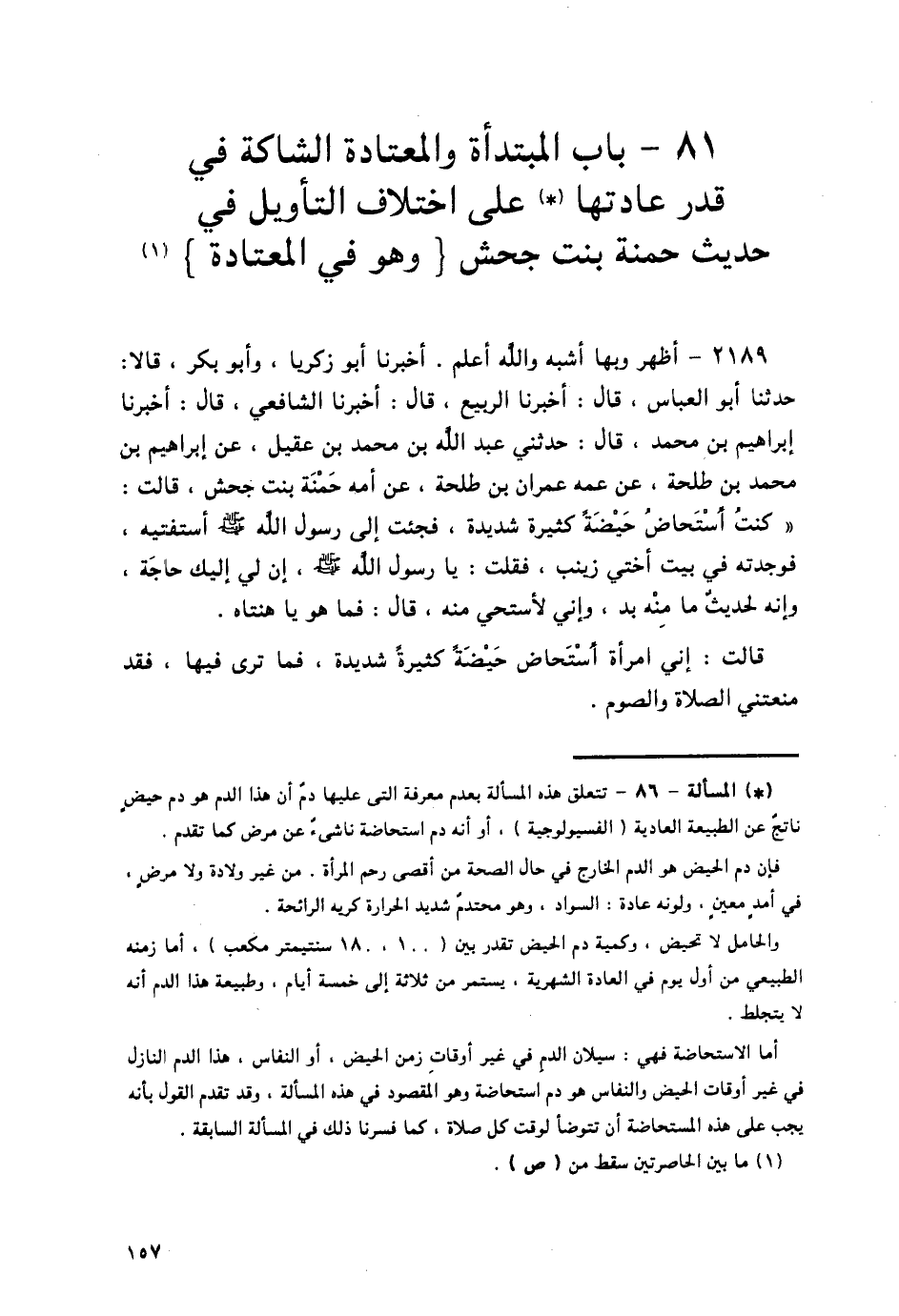 2189 - أَظْهَرُ وَبِهَا أَشْبَهُ وَاللَّهُ أَعْلَمُ , أَخْبَرَنَا أَبُو زَكَرِيَّا، وَأَبُو بَكْرٍ , قَالَا: حَدَّثَنَا أَبُو الْعَبَّاسِ قَالَ: أَخْبَرَنَا الرَّبِيعُ قَالَ: أَخْبَرَنَا الشَّافِعِيُّ قَالَ: أَخْبَرَنَا إِبْرَاهِيمُ بْنُ مُحَمَّدٍ قَالَ: حَدَّثَنِي عَبْدُ اللَّهِ بْنُ مُحَمَّدِ بْنِ عَقِيلٍ، عَنْ إِبْرَاهِيمَ بْنِ مُحَمَّدِ بْنِ طَلْحَةَ، عَنْ عَمِّهِ عِمْرَانَ بْنِ طَلْحَةَ , عَنْ أُمِّهِ، حَمْنَةَ بِنْتِ جَحْشٍ , قَالَتْ: كُنْتُ أُسْتَحَاضُ حَيْضَةً كَثِيرَةً شَدِيدَةً , فَجِئْتُ إِلَى رَسُولِ اللَّهِ صَلَّى اللهُ عَلَيْهِ وَسَلَّمَ، أَسْتَفْتِيهِ، فَوَجَدْتُهُ فِي بَيْتِ أُخْتِي زَيْنَبَ، فَقُلْتُ: يَا رَسُولَ اللَّهِ صَلَّى اللهُ عَلَيْهِ وَسَلَّمَ , إِنَّ لِي إِلَيْكَ حَاجَةً، وَإِنَّهُ لَحَدِيثٌ مَا مِنْهُ بُدٌّ، وَإِنِّي لَأَسْتَحِي مِنْهُ , قَالَ: «فَمَا هُوَ يَا هَنْتَاهُ». قَالَتْ: إِنِّي امْرَأَةٌ أُسْتَحَاضُ حَيْضَةً كَثِيرَةً شَدِيدَةً , فَمَا تَرَى فِيهَا , فَقَدْ مَنَعَتْنِي الصَّلَاةَ وَالصَّوْمَ -[158]-. فَقَالَ النَّبِيُّ صَلَّى اللهُ عَلَيْهِ وَسَلَّمَ: «إِنِّي أَنْعَتُ لَكِ الْكُرْسُفَ , فَإِنَّهُ يُذْهِبُ الدَّمَ». قَالَتْ: هُوَ أَكْثَرُ مِنْ ذَلِكَ. قَالَ النَّبِيُّ صَلَّى اللهُ عَلَيْهِ وَسَلَّمَ: «فَتَلَجَّمِي» قَالَتْ: هُوَ أَكْثَرُ مِنْ ذَلِكَ قَالَ: «فَاتَّخِذِي ثَوْبًا» , قَالَتْ: هُوَ أَكْثَرُ مِنْ ذَلِكَ , إِنَّمَا أَثُجُّ ثَجًّا. قَالَ النَّبِيُّ صَلَّى اللهُ عَلَيْهِ وَسَلَّمَ: " سَآمُرُكِ بِأَمْرَيْنِ: أَيُّهُمَا فَعَلْتِ أَجْزَأَكِ مِنَ الْآخَرِ , فَإِنْ قَوِيتِ عَلَيْهِمَا , فَأَنْتِ أَعْلَمُ " قَالَ لَهَا: «إِنَّمَا §هِيَ رَكْضَةٌ مِنْ رَكَضَاتِ الشَّيْطَانِ فَتَحَيَّضِي سِتَّةَ أَيَّامٍ , أَوْ سَبْعَةَ أَيَّامٍ , فِي عِلْمِ اللَّهِ , ثُمَّ اغْتَسِلِي , حَتَّى إِذَا رَأَيْتِ أَنَّكِ قَدْ طَهُرْتِ وَاسْتَنْقَيْتِ فَصَلِّي أَرْبَعًا وَعِشْرِينَ لَيْلَةً وَأَيَّامَهَا , أَوْ ثَلَاثًا وَعِشْرِينَ لَيْلَةً، وَأَيَّامَهَا , وَصُومِي، فَإِنَّهُ يُجْزِئُكِ , وَكَذَلِكَ افْعَلِي فِي كُلِّ شَهْرٍ , كَمَا تَحِيضُ النِّسَاءُ، وَكَمَا يَطْهُرْنَ , لِمِيقَاتِ حَيْضِهِنَّ، وَطُهْرِهِنَّ»