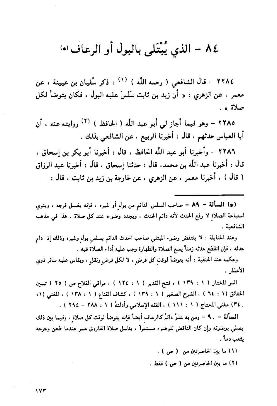 2284 - قَالَ الشَّافِعِيُّ، رَحِمَهُ اللَّهُ ذَكَرَ سُفْيَانُ بْنُ عُيَيْنَةَ، عَنْ مَعْمَرٍ، عَنِ الزُّهْرِيِّ، أَنَّ زَيْدَ بْنَ ثَابِتٍ §سَلَسَ عَلَيْهِ الْبَوْلُ , فَكَانَ يَتَوَضَّأُ لِكُلِّ صَلَاةٍ