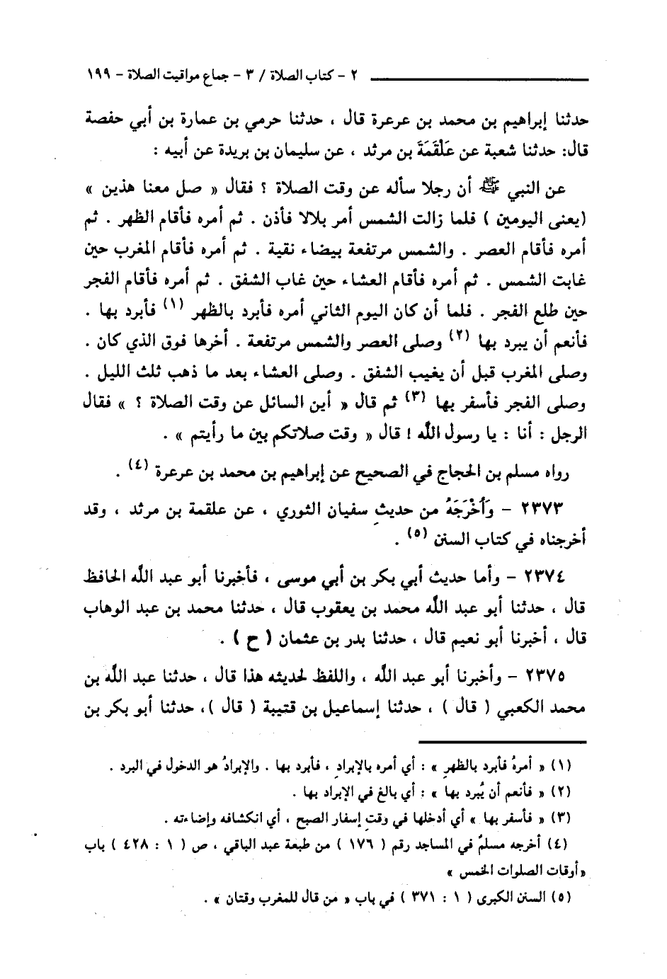 2375 - وَأَخْبَرَنَا أَبُو عَبْدِ اللَّهِ، وَاللَّفْظُ لِحَدِيثِهِ هَذَا قَالَ: حَدَّثَنَا عَبْدُ اللَّهِ بْنُ مُحَمَّدٍ الْكَعْبِيُّ قَالَ: حَدَّثَنَا إِسْمَاعِيلُ بْنُ قُتَيْبَةَ قَالَ: حَدَّثَنَا أَبُو بَكْرِ بْنُ -[200]- أَبِي شَيْبَةَ قَالَ: حَدَّثَنَا وَكِيعٌ، عَنْ بَدْرِ بْنِ عُثْمَانَ، عَنْ أَبِي بَكْرِ بْنِ أَبِي مُوسَى، سَمِعْتُهُ مِنْهُ، عَنْ أَبِيهِ: أَنَّ سَائِلًا أَتَى النَّبِيَّ صَلَّى اللهُ عَلَيْهِ وَسَلَّمَ فَسَأَلَهُ عَنْ مَوَاقِيتِ الصَّلَاةِ فَلَمْ يَرُدَّ عَلَيْهِ شَيْئًا، قَالَ: §فَأَقَامَ الْفَجْرَ حِينَ انْشَقَّ الْفَجْرُ. وَالنَّاسُ لَا يَكَادُ يَعْرِفُ بَعْضُهُمْ بَعْضًا، ثُمَّ أَمَرَهُ فَأَقَامَ بِالظُّهْرِ حِينَ زَالَتِ الشَّمْسُ، وَالْقَائِلُ يَقُولُ: قَدِ انْتَصَفَ النَّهَارُ، وَهُوَ كَانَ أَعْلَمُ مِنْهُمْ، ثُمَّ أَمَرَهُ فَأَقَامَ بِالْعَصْرِ وَالشَّمْسُ مُرْتَفِعَةٌ، ثُمَّ أَمَرَهُ فَأَقَامَ بِالْمَغْرِبِ حِينَ وَقَعَتِ الشَّمْسُ، ثُمَّ أَمَرَهُ فَأَقَامَ الْعِشَاءَ حِينَ غَابَ الشَّفَقُ، ثُمَّ أَخَّرَ الْفَجْرَ مِنَ الْغَدِ حَتَّى انْصَرَفَ مِنْهَا، الْقَائِلُ يَقُولُ: قَدْ طَلَعَتِ الشَّمْسُ أَوْ كَادَتْ ثُمَّ أَخَّرَ الظُّهْرَ حَتَّى كَانَ قَرِيبًا مِنْ وَقْتِ الْعَصْرِ بِالْأَمْسِ، ثُمَّ أَخَّرَ الْعَصْرَ حَتَّى انْصَرَفَ مِنْهَا، وَالْقَائِلُ يَقُولُ: قَدِ احْمَرَّتِ الشَّمْسُ، ثُمَّ أَخَّرَ الْمَغْرِبَ حَتَّى كَانَ عِنْدَ سُقُوطِ الشَّفَقِ، ثُمَّ أَخَّرَ الْعِشَاءَ حَتَّى كَانَ ثُلُثُ اللَّيْلِ الْأَوَّلُ. ثُمَّ أَصْبَحَ فَدَعَا السَّائِلَ فَقَالَ: «الْوَقْتُ بَيْنَ هَذَيْنِ» رَوَاهُ مُسْلِمٌ فِي الصَّحِيحِ عَنْ أَبِي بَكْرِ بْنِ أَبِي شَيْبَةَ