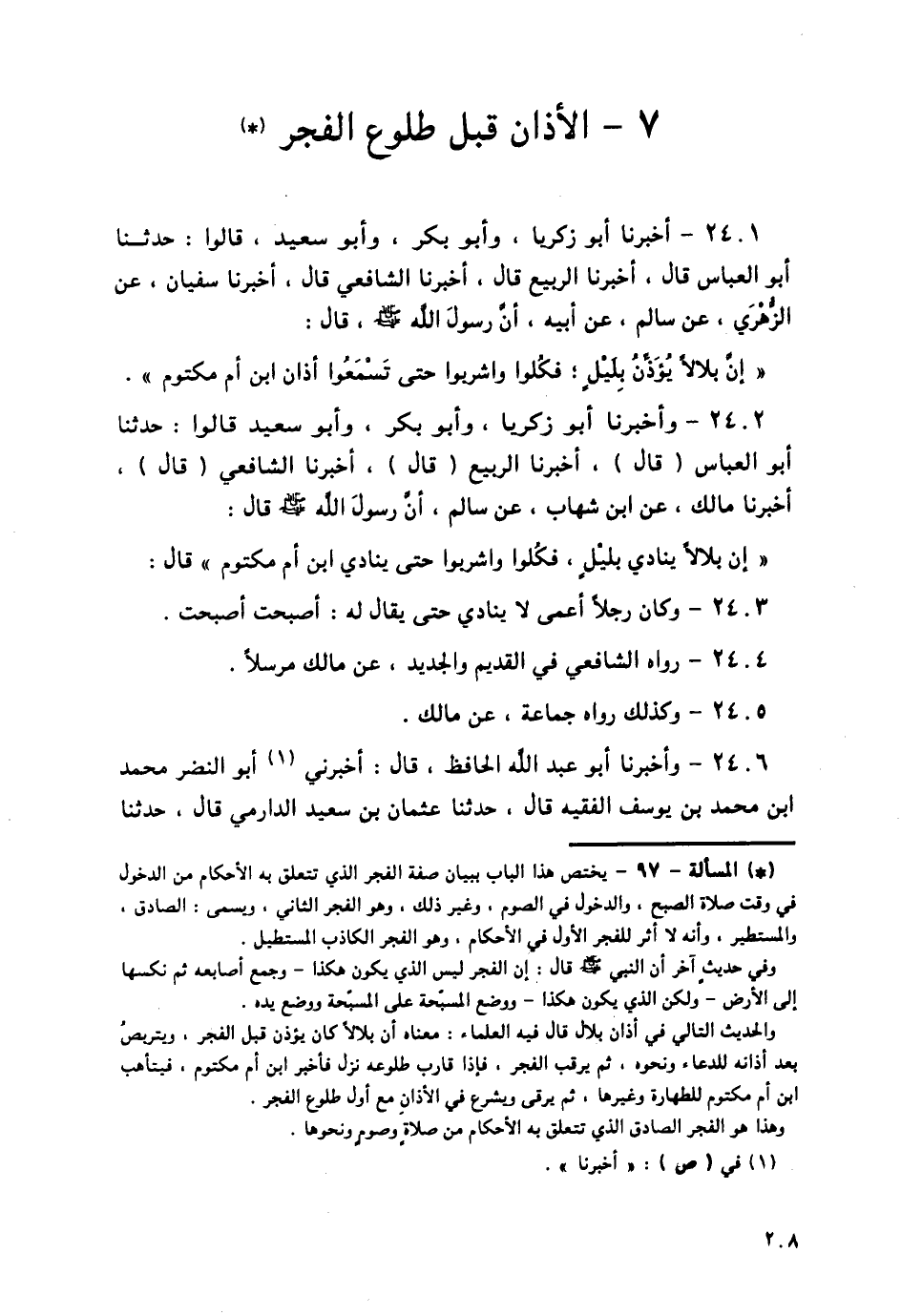 2406 - وَأَخْبَرَنَا أَبُو عَبْدِ اللَّهِ الْحَافِظُ قَالَ: أَخْبَرَنِي أَبُو النَّضْرِ مُحَمَّدُ بْنُ مُحَمَّدِ بْنِ يُوسُفَ الْفَقِيهُ قَالَ: حَدَّثَنَا عُثْمَانُ بْنُ سَعِيدٍ الدَّارِمِيُّ قَالَ: حَدَّثَنَا -[209]- الْقَعْنَبِيُّ، فِيمَا قَرَأَ عَلَى مَالِكٍ، عَنِ ابْنِ شِهَابٍ، عَنْ سَالِمِ بْنِ عَبْدِ اللَّهِ، عَنْ أَبِيهِ، أَنَّ رَسُولَ اللَّهِ صَلَّى اللهُ عَلَيْهِ وَسَلَّمَ قَالَ: «إِنَّ §بِلَالًا يُنَادِي بِلَيْلٍ فَكُلُوا، وَاشْرَبُوا حَتَّى يُنَادِيَ ابْنُ أُمِّ مَكْتُومٍ»