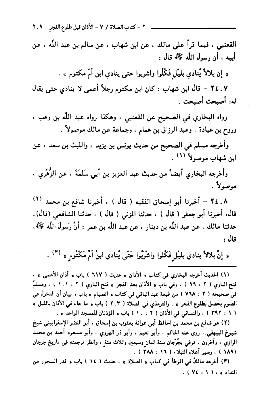 2408 - أَخْبَرَنَا أَبُو إِسْحَاقَ الْفَقِيهُ قَالَ: أَخْبَرَنَا شَافِعُ بْنُ مُحَمَّدٍ قَالَ: أَخْبَرَنَا أَبُو جَعْفَرٍ قَالَ: حَدَّثَنَا الْمُزَنِيُّ قَالَ: حَدَّثَنَا الشَّافِعِيُّ قَالَ: حَدَّثَنَا مَالِكٌ، عَنْ عَبْدِ اللَّهِ بْنِ دِينَارٍ، عَنْ عَبْدِ اللَّهِ بْنِ عُمَرَ، أَنَّ رَسُولَ اللَّهِ صَلَّى اللهُ عَلَيْهِ وَسَلَّمَ قَالَ: «إِنَّ §بِلَالًا يُنَادِي بِلَيْلٍ فَكُلُوا، وَاشْرَبُوا حَتَّى يُنَادِيَ ابْنُ أُمِّ مَكْتُومٍ» -[210]-