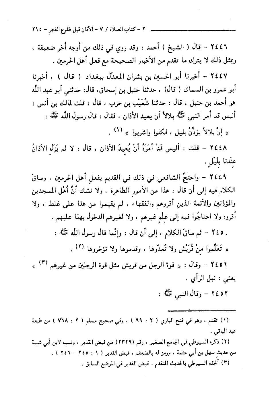 2447 - أَخْبَرَنَا أَبُو الْحُسَيْنِ بْنُ بِشْرَانَ الْمُعَدِّلِ، بِبَغْدَادَ قَالَ: أَخْبَرَنَا أَبُو عَمْرِو بْنُ السَّمَّاكِ قَالَ: حَدَّثَنَا حَنْبَلُ بْنُ إِسْحَاقَ قَالَ: حَدَّثَنِي أَبُو عَبْدِ اللَّهِ هُوَ أَحْمَدُ بْنُ حَنْبَلٍ قَالَ: حَدَّثَنَا شُعَيْبُ بْنُ حَرْبٍ قَالَ: قُلْتُ لِمَالِكِ بْنِ أَنَسٍ: أَلَيْسَ قَدْ أَمَرَ النَّبِيُّ صَلَّى اللهُ عَلَيْهِ وَسَلَّمَ بِلَالًا أَنْ يُعِيدَ الْأَذَانَ، فَقَالَ: قَالَ رَسُولُ اللَّهِ صَلَّى اللهُ عَلَيْهِ وَسَلَّمَ: «إِنَّ §بِلَالًا يُؤَذِّنُ بِلَيْلٍ، فَكُلُوا وَاشْرَبُوا»