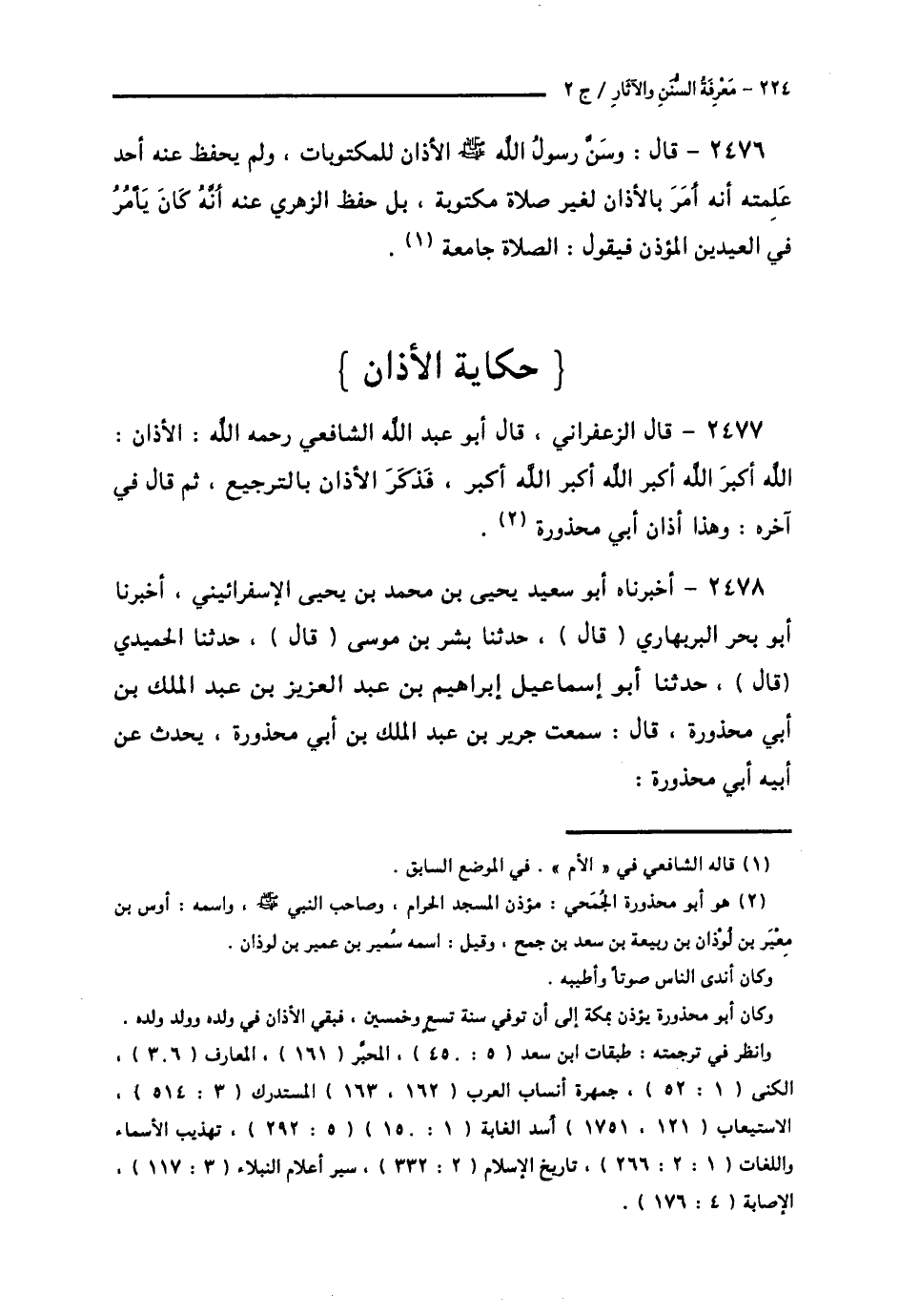 2478 - أَخْبَرَنَاهُ أَبُو سَعِيدٍ يَحْيَى بْنُ مُحَمَّدِ بْنِ يَحْيَى الْإِسْفَرَايِينِيُّ، أَخْبَرَنَا أَبُو بَحْرٍ الْبَرْبَهَارِيُّ قَالَ: حَدَّثَنَا بِشْرُ بْنُ مُوسَى قَالَ: حَدَّثَنَا الْحُمَيْدِيُّ قَالَ: حَدَّثَنَا أَبُو إِسْمَاعِيلَ إِبْرَاهِيمُ بْنُ عَبْدِ الْعَزِيزِ بْنِ عَبْدِ الْمَلِكِ بْنِ أَبِي مَحْذُورَةَ قَالَ: سَمِعْتُ جَرِيرَ بْنَ عَبْدِ الْمَلِكِ بْنِ أَبِي مَحْذُورَةَ، يُحَدِّثُ عَنْ أَبِيهِ أَبِي مَحْذُورَةَ -[225]-: أَنَّ النَّبِيَّ صَلَّى اللهُ عَلَيْهِ وَسَلَّمَ أَلْقَى هَذَا الْأَذَانَ عَلَيْهِ: «اللَّهُ أَكْبَرُ اللَّهُ أَكْبَرُ، اللَّهُ أَكْبَرُ اللَّهُ أَكْبَرُ، أَشْهَدُ أَنْ لَا إِلَهَ إِلَّا اللَّهُ، أَشْهَدُ أَنْ لَا إِلَهَ اللَّهَ، أَشْهَدُ أَنَّ مُحَمَّدًا رَسُولُ اللَّهِ، أَشْهَدُ أَنَّ مُحَمَّدًا رَسُولُ اللَّهِ، أَشْهَدُ أَنَّ لَا إِلَهَ إِلَّا اللَّهُ، أَشْهَدُ أَنْ لَا إِلَهَ إِلَّا اللَّهُ، أَشْهَدُ أَنَّ مُحَمَّدًا رَسُولُ اللَّهِ، أَشْهَدُ أَنَّ مُحَمَّدًا رَسُولُ اللَّهِ، حَيَّ عَلَى الصَّلَاةِ، حَيَّ عَلَى الصَّلَاةِ، حَيَّ عَلَى الْفَلَاحِ، حَيَّ عَلَى الْفَلَاحِ، اللَّهُ أَكْبَرُ اللَّهُ أَكْبَرُ، لَا إِلَهَ إِلَّا اللَّهُ»