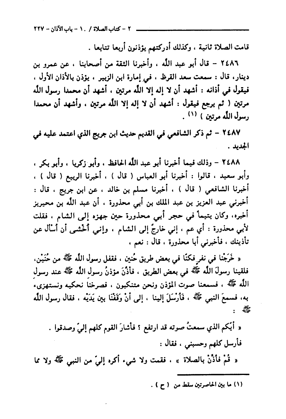 2488 - وَذَلِكَ فِيمَا أَخْبَرَنَا أَبُو عَبْدِ اللَّهِ الْحَافِظُ، وَأَبُو زَكَرِيَّا، وَأَبُو بَكْرٍ، وَأَبُو سَعِيدٍ، قَالُوا: أَخْبَرَنَا أَبُو الْعَبَّاسِ قَالَ: أَخْبَرَنَا الرَّبِيعُ قَالَ: أَخْبَرَنَا الشَّافِعِيُّ قَالَ: أَخْبَرَنَا مُسْلِمُ بْنُ خَالِدٍ، عَنِ ابْنِ جُرَيْجٍ قَالَ: أَخْبَرَنِي عَبْدُ الْعَزِيزِ بْنُ عَبْدِ الْمَلِكِ بْنِ أَبِي مَحْذُورَةَ، أَنَّ عَبْدَ اللَّهِ بْنَ مُحَيْرِيزِ، أَخْبَرَهُ وَكَانَ يَتِيمًا فِي حِجْرِ أَبِي مَحْذُورَةَ حِينَ جَهَّزَهُ إِلَى الشَّامِ، فَقُلْتُ لِأَبِي مَحْذُورَةَ: أَيْ عَمِّ، إِنِّي خَارِجٌ إِلَى الشَّامِ، وَإِنِّي أَخْشَى أَنْ أُسْأَلَ عَنْ تَأْذِينِكَ، فَأَخْبِرْنِي أَبَا مَحْذُورَةَ قَالَ: نَعَمْ. خَرَجْنَا فِي نَفَرٍ فَكُنَّا فِي بَعْضِ طَرِيقِ حُنَيْنٍ، فَقَفَلَ رَسُولُ اللَّهِ صَلَّى اللهُ عَلَيْهِ وَسَلَّمَ، مِنْ حُنَيْنٍ فَلَقِيَنَا رَسُولُ اللَّهِ صَلَّى اللهُ عَلَيْهِ وَسَلَّمَ فِي بَعْضِ الطَّرِيقِ، فَأَذَّنَ مُؤَذِّنُ رَسُولِ اللَّهِ صَلَّى اللهُ عَلَيْهِ وَسَلَّمَ، عِنْدَ رَسُولِ اللَّهِ صَلَّى اللهُ عَلَيْهِ وَسَلَّمَ، فَسَمِعْنَا صَوْتَ الْمُؤَذِّنِ، وَنَحْنُ مُتَنَكِّبُونَ، فَصَرَخْنَا نَحْكِيهِ، وَنَسْتَهْزِئُ بِهِ فَسَمِعَ النَّبِيُّ صَلَّى اللهُ عَلَيْهِ وَسَلَّمَ، فَأَرْسَلَ إِلَيْنَا، إِلَى أَنْ وَقَفْنَا بَيْنَ يَدَيْهِ، فَقَالَ رَسُولُ اللَّهِ صَلَّى اللهُ عَلَيْهِ وَسَلَّمَ: «أَيُّكُمُ الَّذِي سَمِعْتُ صَوْتَهُ قَدِ ارْتَفَعَ؟». فَأَشَارَ الْقَوْمُ كُلُّهُمْ إِلَيَّ وَصَدَقُوا، فَأَرْسَلَ كُلَّهُمْ وَحَبَسَنِي، فَقَالَ: «قُمْ فَأَذِّنْ بِالصَّلَاةِ». فَقُمْتُ، وَلَا شَيْءَ أَكْرَهُ إِلَيَّ مِنَ النَّبِيِّ صَلَّى اللهُ عَلَيْهِ وَسَلَّمَ وَلَا مِمَّا -[228]- يَأْمُرُنِي بِهِ، فَقُمْتُ بَيْنَ يَدَيْ رَسُولِ اللَّهِ صَلَّى اللهُ عَلَيْهِ وَسَلَّمَ، فَأَلْقَى عَلَيَّ رَسُولُ اللَّهِ صَلَّى اللهُ عَلَيْهِ وَسَلَّمَ، التَّأْذِينَ هُوَ نَفْسُهُ، فَقَالَ: " قُلْ: §اللَّهُ أَكْبَرُ اللَّهُ أَكْبَرُ اللَّهُ أَكْبَرُ اللَّهُ أَكْبَرُ، أَشْهَدُ أَنْ لَا إِلَهَ إِلَّا اللَّهُ، أَشْهَدُ أَنْ لَا إِلَهَ إِلَّا اللَّهُ، أَشْهَدُ أَنَّ مُحَمَّدًا رَسُولُ اللَّهِ، أَشْهَدُ أَنَّ مُحَمَّدًا رَسُولُ اللَّهِ "، ثُمَّ قَالَ لِي: «ارْجِعْ وَاصْدُدْ مِنْ صَوْتِكَ»، ثُمَّ قَالَ: " قُلْ: أَشْهَدُ أَنْ لَا إِلَهَ إِلَّا اللَّهُ أَشْهَدُ أَنْ لَا إِلَهَ إِلَّا اللَّهُ، أَشْهَدُ أَنَّ مُحَمَّدًا رَسُولُ اللَّهِ، أَشْهَدُ أَنَّ مُحَمَّدًا رَسُولُ اللَّهِ، حَيَّ عَلَى الصَّلَاةِ حَيَّ عَلَى الصَّلَاةِ، حَيَّ عَلَى الْفَلَاحِ حَيَّ عَلَى الْفَلَاحِ، اللَّهُ أَكْبَرُ اللَّهُ أَكْبَرُ، لَا إِلَهَ إِلَّا اللَّهُ ". ثُمَّ دَعَانِي حِينَ قَضَيْتُ التَّأْذِينَ فَأَعْطَانِي صُرَّةً فِيهَا شَيْءٌ مِنْ فِضَّةٍ، ثُمَّ وَضَعَ يَدَهُ عَلَى نَاصِيَةِ أَبِي مَحْذُورَةَ، ثُمَّ أَمَرَّهَا عَلَى وَجْهِهِ، ثُمَّ مَرَّ بَيْنَ ثَدْيَيْهِ، ثُمَّ عَلَى كَبِدِهِ، ثُمَّ بَلَغَتْ يَدُهُ سُرَّةَ أَبِي مَحْذُورَةَ، ثُمَّ قَالَ رَسُولُ اللَّهِ صَلَّى اللهُ عَلَيْهِ وَسَلَّمَ: «بَارَكَ اللَّهُ لَكَ فِيكَ وَبَارَكَ عَلَيْكَ». فَقُلْتُ: يَا رَسُولَ اللَّهِ مُرْنِي بِالتَّأْذِينِ بِمَكَّةَ، فَقَالَ: «قَدْ أَمَرْتُكَ بِهِ». وَذَهَبَ كُلُّ شَيْءٍ كَانَ لِرَسُولِ اللَّهِ صَلَّى اللهُ عَلَيْهِ وَسَلَّمَ مِنْ كَرَاهِيَةٍ، وَعَادَ ذَلِكَ كُلُّهُ مَحَبَّةً لِلنَّبِيِّ صَلَّى اللهُ عَلَيْهِ وَسَلَّمَ، فَقَدِمْتُ عَلَى عَتَّابِ بْنِ أُسَيْدٍ، عَامَلِ رَسُولِ اللَّهِ صَلَّى اللهُ عَلَيْهِ وَسَلَّمَ، فَأَذَّنْتُ بِالصَّلَاةِ عَنْ أَمْرِ رَسُولِ اللَّ