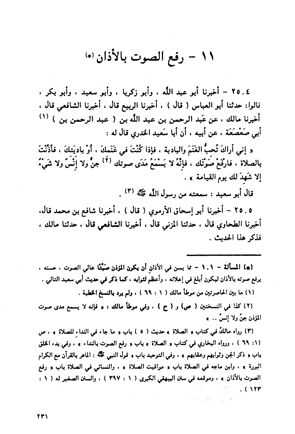 2504 - أَخْبَرَنَا أَبُو عَبْدِ اللَّهِ، وَأَبُو زَكَرِيَّا، وَأَبُو سَعِيدٍ، وَأَبُو بَكْرٍ، قَالُوا: حَدَّثَنَا أَبُو الْعَبَّاسِ قَالَ: أَخْبَرَنَا الرَّبِيعُ قَالَ: أَخْبَرَنَا الشَّافِعِيُّ قَالَ: أَخْبَرَنَا مَالِكٌ، عَنْ عَبْدِ الرَّحْمَنِ بْنِ عَبْدِ اللَّهِ بْنِ عَبْدِ الرَّحْمَنِ بْنِ أَبِي صَعْصَعَةَ، عَنْ أَبِيهِ، أَنَّ أَبَا سَعِيدٍ الْخُدْرِيَّ قَالَ لَهُ: «§إِنِّي أَرَاكَ تُحِبُّ الْغَنَمَ وَالْبَادِيَةَ، فَإِذَا كُنْتَ فِي غَنَمِكَ، أَوْ بَادِيَتِكَ، فَأَذَّنْتَ بِالصَّلَاةِ، فَارْفَعْ صَوْتَكَ، فَإِنَّهُ لَا يَسْمَعُ مَدَى صَوْتِكَ جِنٌّ، وَلَا إِنْسٌ وَلَا شَيْءٌ إِلَّا شَهِدَ لَكَ يَوْمَ الْقِيَامَةِ» قَالَ أَبُو سَعِيدٍ: سَمِعْتُهُ مِنْ رَسُولِ اللَّهِ صَلَّى اللهُ عَلَيْهِ وَسَلَّمَ