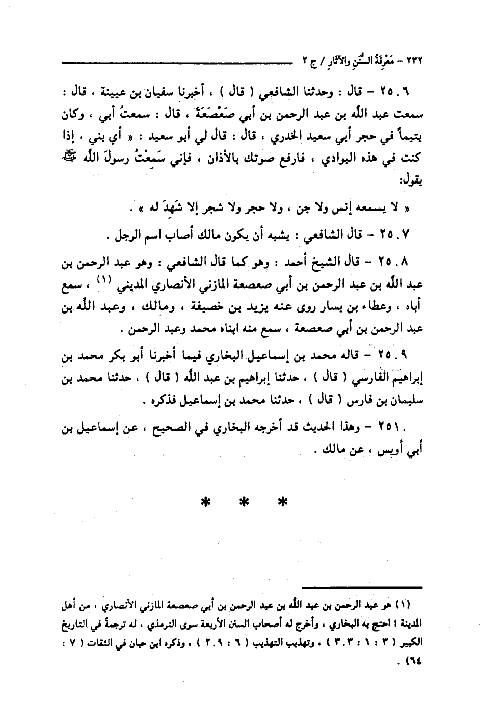 2506 - قَالَ: وَحَدَّثَنَا الشَّافِعِيُّ قَالَ: أَخْبَرَنَا سُفْيَانُ بْنُ عُيَيْنَةَ قَالَ: سَمِعْتُ عَبْدَ الرَّحْمَنِ بْنَ عَبْدِ اللَّهِ بْنِ أَبِي صَعْصَعَةَ قَالَ: سَمِعْتُ أَبِيَ، وَكَانَ يَتِيمًا فِي حِجْرِ أَبِي سَعِيدٍ الْخُدْرِيِّ قَالَ: قَالَ لِي أَبُو سَعِيدٍ: أَيْ بُنَيَّ، إِذَا كُنْتَ فِي هَذِهِ الْبَوَادِي، فَارْفَعْ صَوْتَكَ بِالْأَذَانِ، فَإِنِّي سَمِعْتُ رَسُولَ اللَّهِ صَلَّى اللهُ عَلَيْهِ وَسَلَّمَ يَقُولُ: «§لَا يَسْمَعُهُ إِنْسٌ، وَلَا جِنٌّ، وَلَا حَجَرٌ، وَلَا شَجَرٌ إِلَّا شَهِدَ لَهُ»