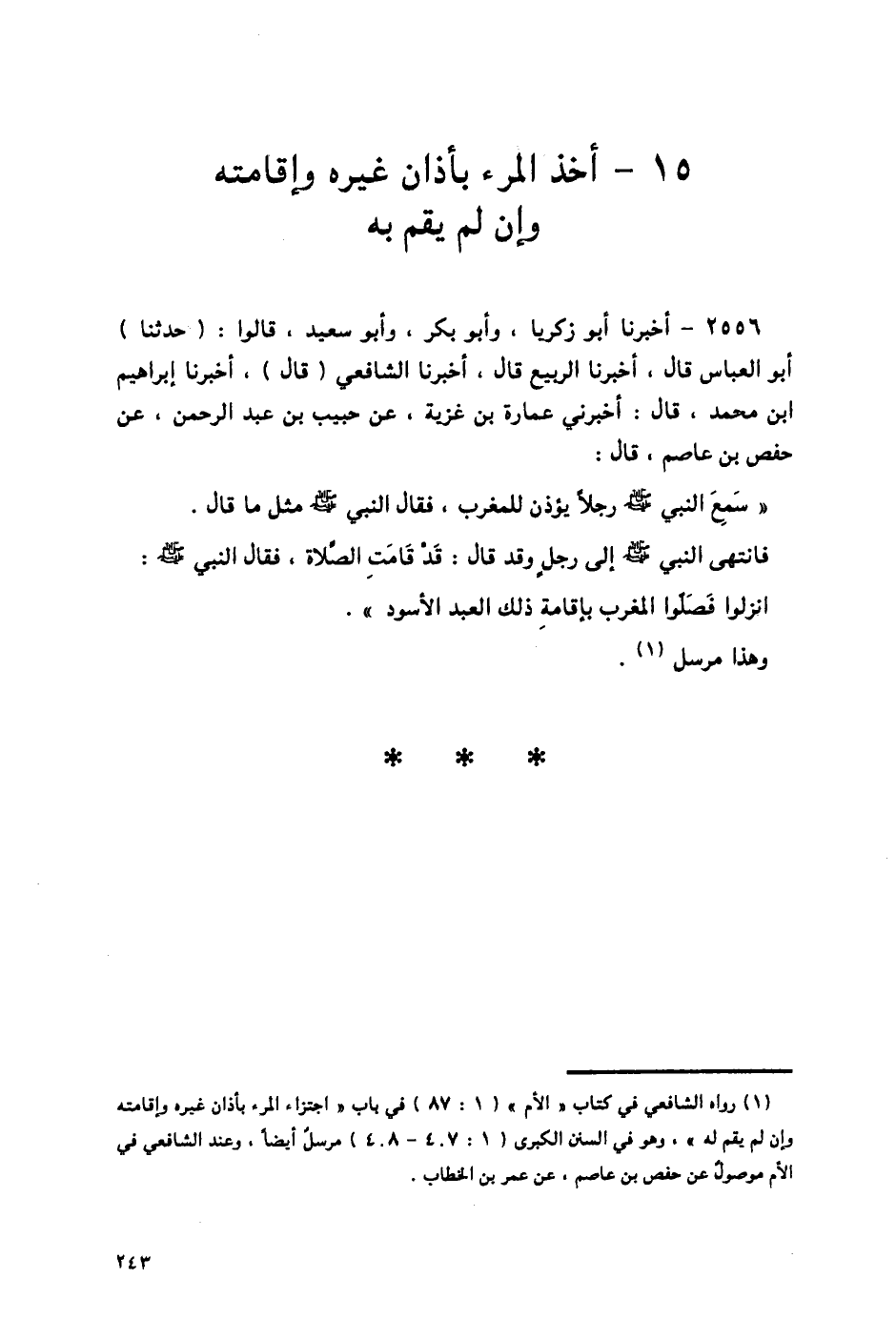 2556 - أَخْبَرَنَا أَبُو زَكَرِيَّا، وَأَبُو بَكْرٍ، وَأَبُو سَعِيدٍ، قَالُوا: حَدَّثَنَا أَبُو الْعَبَّاسِ قَالَ: أَخْبَرَنَا الرَّبِيعُ قَالَ: أَخْبَرَنَا الشَّافِعِيُّ، قَالَ أَخْبَرَنَا إِبْرَاهِيمُ بْنُ مُحَمَّدٍ قَالَ: أَخْبَرَنِي عُمَارَةُ بْنُ غَزِيَّةَ، عَنْ خُبَيْبِ بْنِ عَبْدِ الرَّحْمَنِ، عَنْ حَفْصِ بْنِ عَاصِمٍ قَالَ: سَمِعَ النَّبِيُّ صَلَّى اللهُ عَلَيْهِ وَسَلَّمَ رَجُلًا يُؤَذِّنُ لِلْمَغْرِبِ، فَقَالَ النَّبِيُّ صَلَّى اللهُ عَلَيْهِ وَسَلَّمَ مِثْلَ مَا قَالَ: فَانْتَهَى النَّبِيُّ صَلَّى اللهُ عَلَيْهِ وَسَلَّمَ إِلَى رَجُلٍ، وَقَدْ قَالَ: قَدْ قَامَتِ الصَّلَاةُ، فَقَالَ النَّبِيُّ صَلَّى اللهُ عَلَيْهِ وَسَلَّمَ: § «انْزِلُوا فَصَلُّوا الْمَغْرِبَ بِإِقَامَةِ ذَلِكَ الْعَبْدِ الْأَسْوَدِ» وَهَذَا مُرْسَلٌ