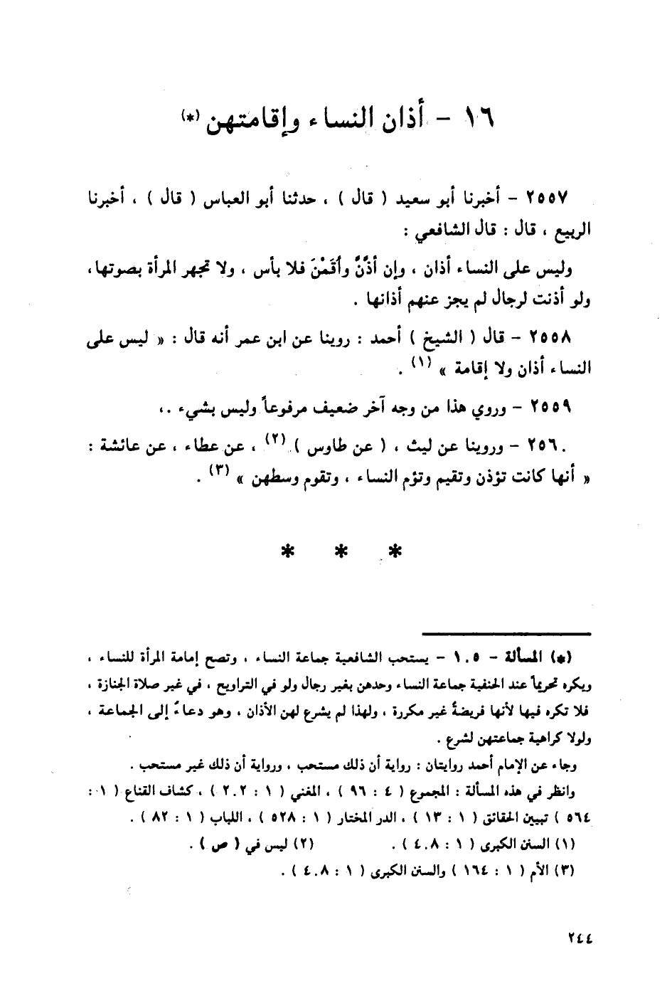 2557 - أَخْبَرَنَا أَبُو سَعِيدٍ قَالَ: حَدَّثَنَا أَبُو الْعَبَّاسِ قَالَ: أَخْبَرَنَا الرَّبِيعُ قَالَ: قَالَ الشَّافِعِيُّ: «§وَلَيْسَ عَلَى النِّسَاءِ أَذَانٌ، وَإِنْ أَذَّنَّ، وَأَقَمْنَ فَلَا بَأْسَ، وَلَا تَجْهَرُ الْمَرْأَةُ بِصَوْتِهَا، وَلَوْ أَذَّنَتْ لِرِجَالٍ لَمْ يُجْزِ عَنْهُمْ أَذَانُهَا»