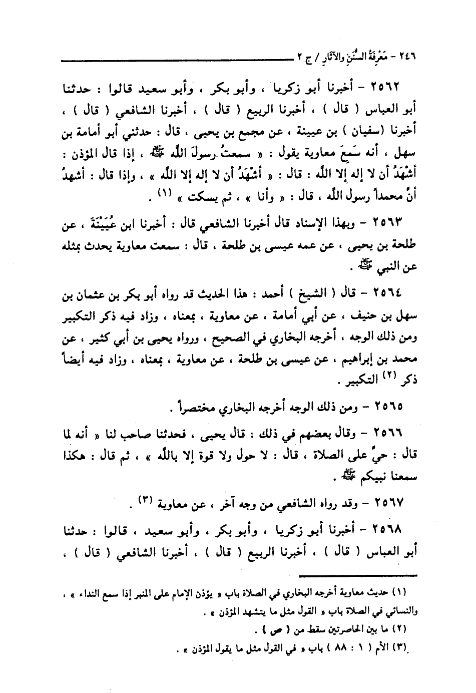 2562 - أَخْبَرَنَا أَبُو زَكَرِيَّا، وَأَبُو بَكْرٍ، وَأَبُو سَعِيدٍ، قَالُوا: حَدَّثَنَا أَبُو الْعَبَّاسِ قَالَ: أَخْبَرَنَا الرَّبِيعُ قَالَ: أَخْبَرَنَا الشَّافِعِيُّ قَالَ: أَخْبَرَنَا سُفْيَانُ بْنُ عُيَيْنَةَ، عَنْ مُجَمِّعِ بْنِ يَحْيَى قَالَ: حَدَّثَنِي أَبُو أُمَامَةَ بْنُ سَهْلٍ أَنَّهُ: سَمِعَ مُعَاوِيَةَ، يَقُولُ: سَمِعْتُ رَسُولَ اللَّهِ صَلَّى اللهُ عَلَيْهِ وَسَلَّمَ §إِذَا قَالَ الْمُؤَذِّنُ: أَشْهَدُ أَنْ لَا إِلَهَ إِلَّا اللَّهُ: قَالَ: «أَشْهَدُ أَنْ لَا إِلَهَ إِلَّا اللَّهُ». وَإِذَا قَالَ: أَشْهَدُ أَنَّ مُحَمَّدًا رَسُولُ اللَّهِ قَالَ: «وَأَنَا» ثُمَّ يَسْكُتُ