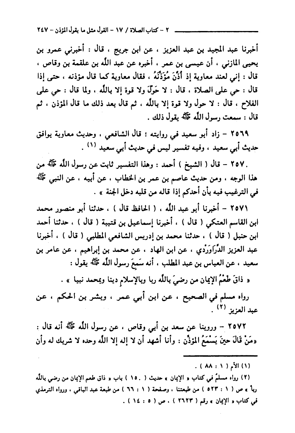 2571 - أَخْبَرَنَا أَبُو عَبْدِ اللَّهِ الْحَافِظُ قَالَ: حَدَّثَنَا أَبُو مَنْصُورٍ مُحَمَّدُ بْنُ الْقَاسِمِ الْعَتَكِيُّ قَالَ: أَخْبَرَنَا إِسْمَاعِيلُ بْنُ قُتَيْبَةَ قَالَ: حَدَّثَنَا أَحْمَدُ بْنُ حَنْبَلٍ قَالَ: حَدَّثَنَا مُحَمَّدُ بْنُ إِدْرِيسَ الشَّافِعِيُّ الْمُطَّلِبِي قَالَ: أَخْبَرَنَا عَبْدُ الْعَزِيزِ الدَّرَاوَرْدِيُّ، عَنِ ابْنِ الْهَادِ، عَنْ مُحَمَّدِ بْنِ إِبْرَاهِيمَ، عَنْ عَامِرِ بْنِ سَعْدٍ، عَنِ الْعَبَّاسِ بْنِ عَبْدِ الْمُطَّلِبِ، أَنَّهُ: سَمِعَ رَسُولَ اللَّهِ صَلَّى اللهُ عَلَيْهِ وَسَلَّمَ يَقُولُ: «§ذَاقَ طَعْمَ الْإِيمَانِ مَنْ رَضِيَ بِاللَّهِ رَبًّا، وَبِالْإِسْلَامِ دِينًا وَبِمُحَمَّدٍ نَبِيًّا» رَوَاهُ مُسْلِمٌ فِي الصَّحِيحِ، عَنِ ابْنِ أَبِي عُمَرَ، وَبِشْرِ بْنِ الْحَكَمِ، عَنْ عَبْدِ الْعَزِيزِ.