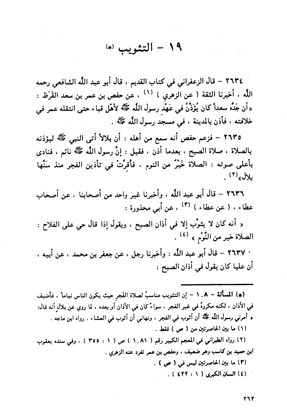 2634 - قَالَ الزَّعْفَرَانِيُّ فِي كِتَابِ الْقَدِيمِ قَالَ أَبُو عَبْدِ اللَّهِ الشَّافِعِيُّ، رَحِمَهُ اللَّهُ، أَخْبَرَنَا الثِّقَةُ، عَنِ الزُّهْرِيِّ، عَنْ حَفْصِ بْنِ عُمَرَ بْنِ سَعْدٍ الْقَرَظِ: «أَنَّ جَدَّهُ سَعْدًا كَانَ يُؤَذِّنُ فِي عَهْدِ رَسُولِ اللَّهِ صَلَّى اللهُ عَلَيْهِ وَسَلَّمَ، لِأَهْلِ قُبَاءَ حَتَّى انْتَقَلَهُ عُمَرُ فِي خِلَافَتِهِ، فَأَذَّنَ بِالْمَدِينَةِ فِي مَسْجِدِ رَسُولِ اللَّهِ صَلَّى اللهُ عَلَيْهِ وَسَلَّمَ»