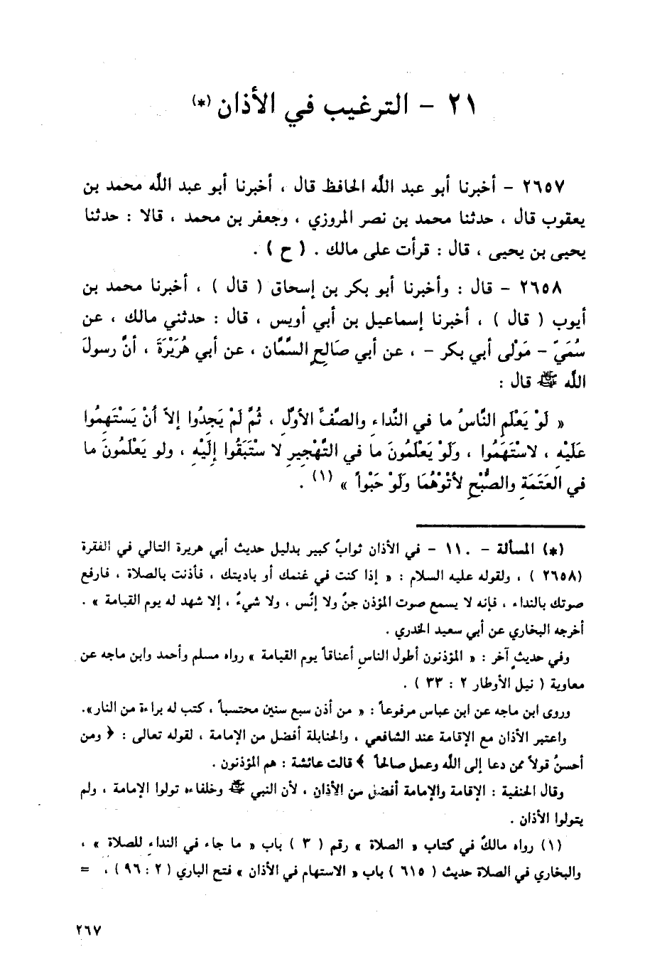 2659 - وَذَكَرَهُ الشَّافِعِيُّ فِي «كِتَابِ الْبُوَيْطِيِّ»، ثُمَّ قَالَ: وَأُحِبُّ الرَّغْبَةَ فِي الْأَذَانِ، وَالصَّفِّ الْأَوَّلِ، وَشُهُودِ الْعِشَاءِ وَالصُّبْحِ، لِحَدِيثِ رَسُولِ اللَّهِ صَلَّى اللهُ عَلَيْهِ وَسَلَّمَ،