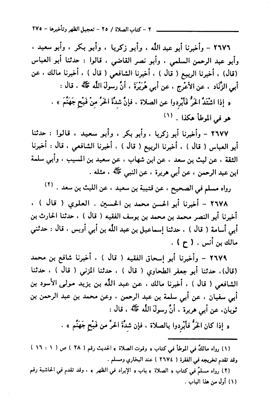 2679 - وَأَخْبَرَنَا أَبُو إِسْحَاقَ الْفَقِيهُ قَالَ: أَخْبَرَنَا شَافِعُ بْنُ مُحَمَّدٍ قَالَ: حَدَّثَنَا أَبُو جَعْفَرٍ الطَّحَاوِيُّ قَالَ: حَدَّثَنَا الْمُزَنِيُّ قَالَ: حَدَّثَنَا الشَّافِعِيُّ قَالَ: أَخْبَرَنَا مَالِكٌ، عَنْ عَبْدِ اللَّهِ بْنِ يَزِيدَ، مَوْلَى الْأَسْوَدِ بْنِ أَبِي سُفْيَانَ، عَنْ أَبِي سَلَمَةَ بْنِ عَبْدِ الرَّحْمَنِ، وَعَنْ مُحَمَّدِ بْنِ عَبْدِ الرَّحْمَنِ بْنِ ثَوْبَانَ، عَنْ أَبِي هُرَيْرَةَ، أَنَّ رَسُولَ اللَّهِ صَلَّى اللهُ عَلَيْهِ وَسَلَّمَ قَالَ: «§إِذَا كَانَ الْحَرُّ فَأَبْرِدُوا بِالصَّلَاةِ، فَإِنَّ شِدَّةَ الْحَرِّ مِنْ فَيْحِ جَهَنَّمَ» -[276]-