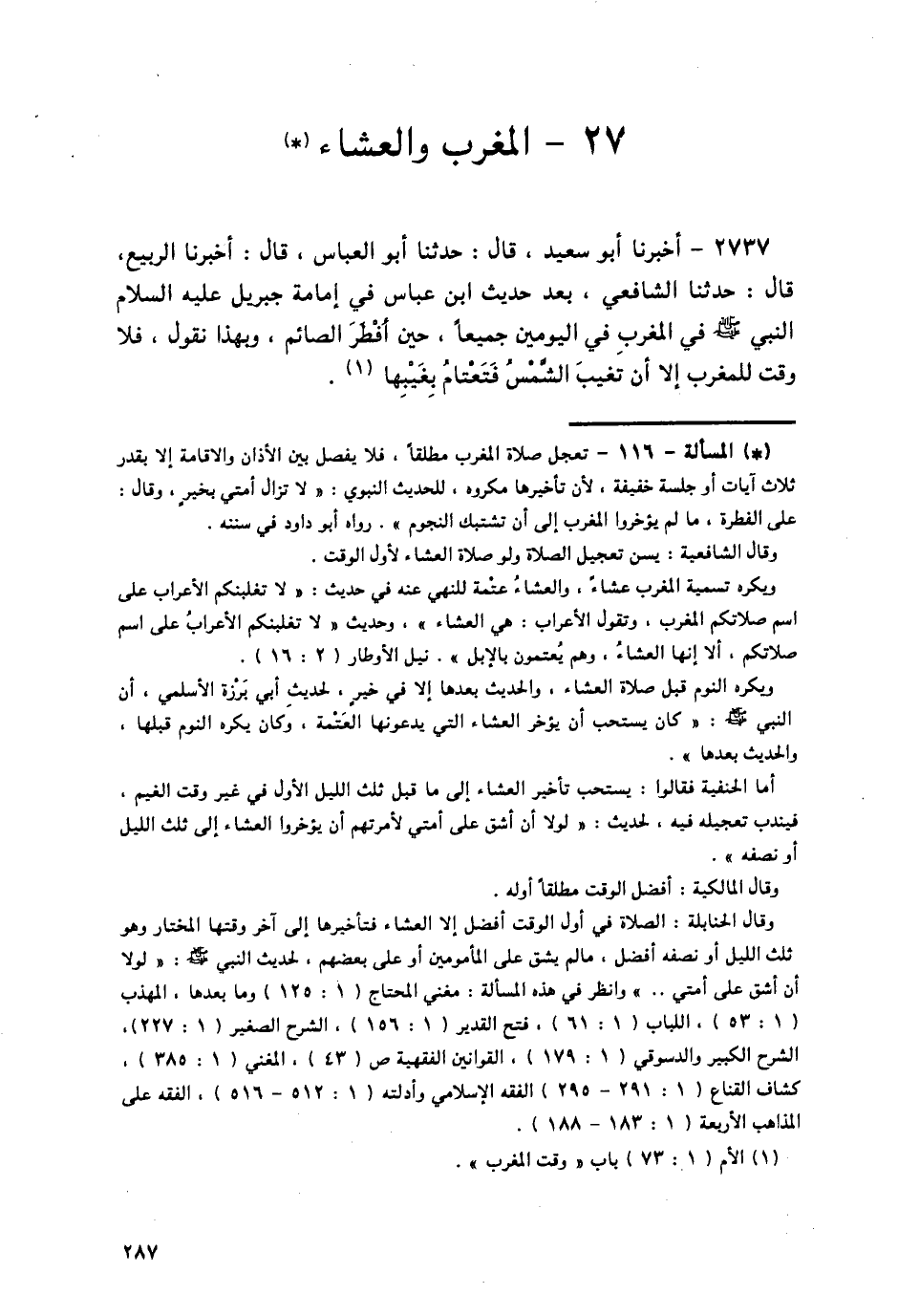 2737 - أَخْبَرَنَا أَبُو سَعِيدٍ قَالَ: حَدَّثَنَا أَبُو الْعَبَّاسِ قَالَ: أَخْبَرَنَا الرَّبِيعُ قَالَ: حَدَّثَنَا الشَّافِعِيُّ، بَعْدَ حَدِيثِ ابْنِ عَبَّاسٍ: «فِي إِمَامَةِ جِبْرِيلَ عَلَيْهِ السَّلَامُ، النَّبِيَّ صَلَّى اللهُ عَلَيْهِ وَسَلَّمَ فِي الْمَغْرِبِ فِي الْيَوْمَيْنِ جَمِيعًا، حِينَ أَفْطَرَ الصَّائِمُ»، وَبِهَذَا نَقُولُ: §فَلَا وَقْتَ لِلْمَغْرِبِ إِلَّا أَنْ تَغِيبَ الشَّمْسُ فَتَعْتَامُ بِغَيْبِهَا -[288]-.