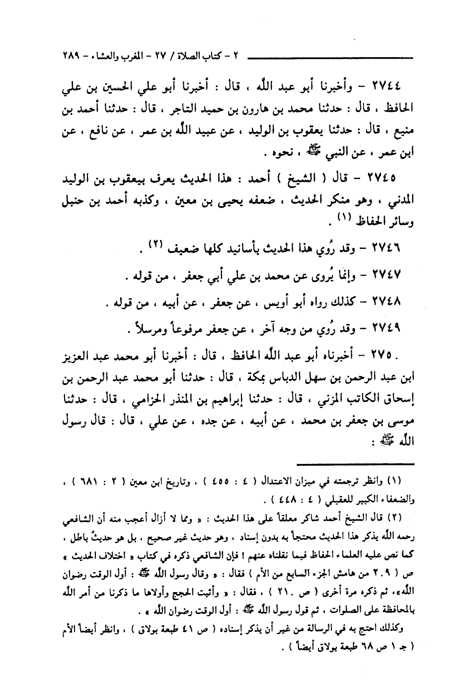 2750 - أَخْبَرَنَاهُ أَبُو عَبْدِ اللَّهِ الْحَافِظُ قَالَ: أَخْبَرَنَا أَبُو مُحَمَّدٍ عَبْدُ الْعَزِيزِ بْنُ عَبْدِ الرَّحْمَنِ بْنِ سَهْلٍ الدَّبَّاسُ، بِمَكَّةَ قَالَ: حَدَّثَنَا أَبُو مُحَمَّدِ عَبْدُ الرَّحْمَنِ بْنُ إِسْحَاقَ الْكَاتِبُ الْمُزَنِيُّ قَالَ: حَدَّثَنَا إِبْرَاهِيمُ بْنُ الْمُنْذِرِ الْحِزَامِيُّ قَالَ: حَدَّثَنَا مُوسَى بْنُ جَعْفَرِ بْنِ مُحَمَّدٍ، عَنْ أَبِيهِ، عَنْ جَدِّهِ، عَنْ عَلِيٍّ قَالَ: قَالَ رَسُولُ اللَّهِ صَلَّى اللهُ عَلَيْهِ وَسَلَّمَ -[290]-: «§أَوَّلُ الْوَقْتِ رِضْوَانُ اللَّهِ، وَآخِرُهُ عَفْوُ اللَّهِ»