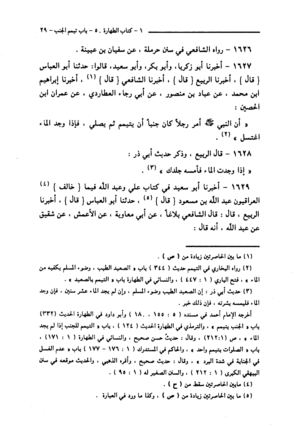 1629 - أَخْبَرَنَا أَبُو سَعِيدٍ فِي كِتَابِ عَلِيٍّ، وَعَبْدِ اللَّهِ، فِيمَا خَالَفَ الْعِرَاقِيُّونَ عَبْدَ اللَّهِ بْنَ مَسْعُودٍ قَالَ: حَدَّثَنَا أَبُو الْعَبَّاسِ قَالَ: أَخْبَرَنَا الرَّبِيعُ قَالَ: قَالَ الشَّافِعِيُّ بَلَاغًا، عَنْ أَبِي مُعَاوِيَةَ، عَنِ الْأَعْمَشِ، عَنْ شَقِيقٍ، عَنْ عَبْدِ اللَّهِ، أَنَّهُ قَالَ -[30]-: «§الْجُنُبُ لَا يَتَيَمَّمُ»