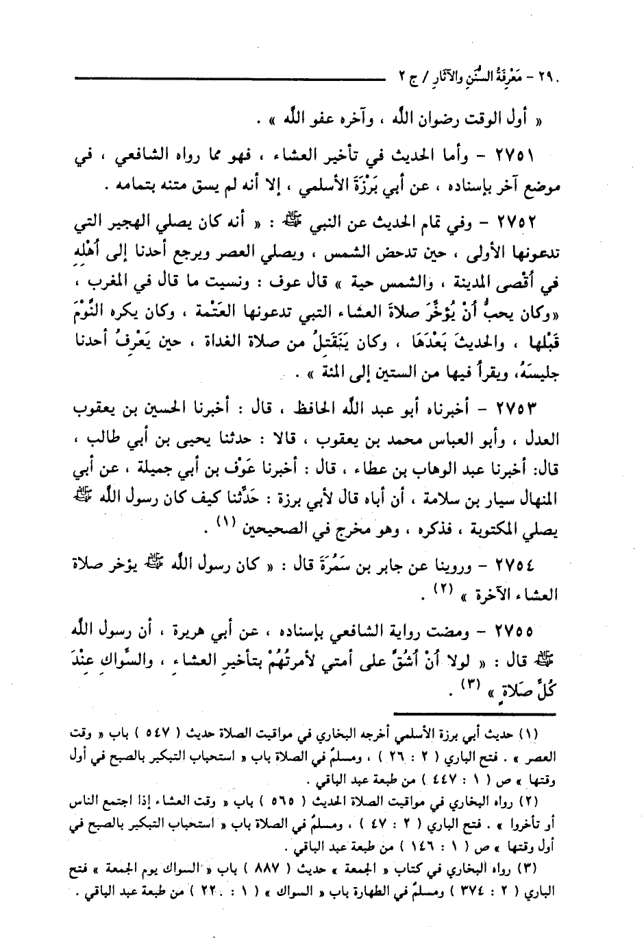 2751 - وَأَمَّا الْحَدِيثُ فِي تَأْخِيرِ الْعِشَاءِ، فَهُوَ مِمَّا رَوَاهُ الشَّافِعِيُّ فِي مَوْضِعٍ آخَرَ بِإِسْنَادِهِ، عَنْ أَبِي بَرْزَةَ الْأَسْلَمِيِّ، إِلَّا أَنَّهُ: لَمْ يَسُقْ مَتْنَهُ بِتَمَامِهِ،