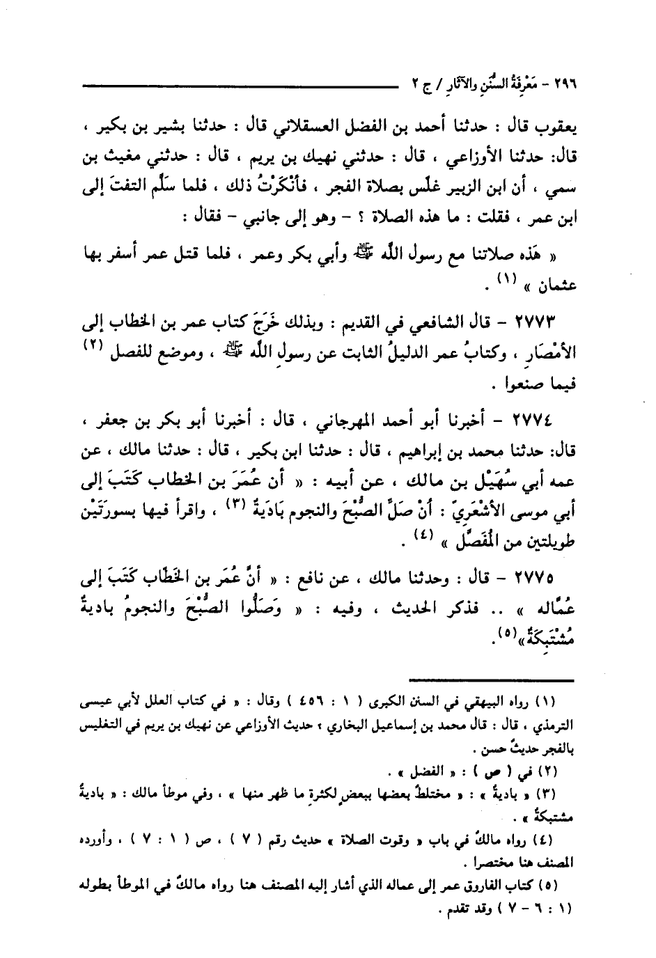 2774 - أَخْبَرَنَا أَبُو أَحْمَدَ الْمِهْرَجَانِيُّ قَالَ: أَخْبَرَنَا أَبُو بَكْرِ بْنُ جَعْفَرٍ قَالَ: حَدَّثَنَا مُحَمَّدُ بْنُ إِبْرَاهِيمَ قَالَ: حَدَّثَنَا ابْنُ بُكَيْرٍ قَالَ: حَدَّثَنَا مَالِكٌ، عَنْ عَمِّهِ أَبِي سُهَيْلِ بْنِ مَالِكٍ، عَنْ أَبِيهِ، أَنَّ عُمَرَ بْنَ الْخَطَّابِ، كَتَبَ إِلَى أَبِي مُوسَى الْأَشْعَرِيِّ: «أَنْ §صَلِّ الصُّبْحَ وَالنُّجُومُ بَادِيَةٌ، وَاقْرَأْ فِيهَا بِسُورَتَيْنِ طَوِيلَتَيْنِ مِنَ الْمُفَصَّلِ»