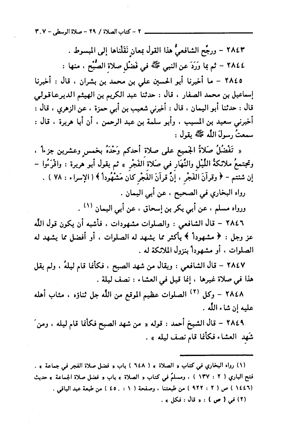 2846 - قَالَ الشَّافِعِيُّ: وَالصَّلَوَاتُ مَشْهُودَاتٌ، فَأَشْبَهَ أَنْ يَكُونَ قَوْلُ اللَّهِ عَزَّ وَجَلَّ: {مَشْهُوَدًا} [الإسراء: 78] بِأَكْثَرَ مِمَّا يُشْهَدُ لَهُ الصَّلَوَاتُ، أَوْ أَفْضَلَ مِمَّا يُشْهَدُ لَهُ الصَّلَوَاتُ، أَوْ مَشْهُوَدًا بِنُزُولِ الْمَلَائِكَةِ لَهُ