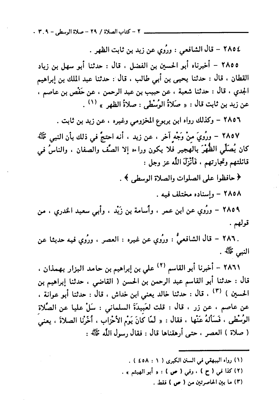 2857 - وَرُوِيَ مِنْ وَجْهٍ آخَرَ، عَنْ زَيْدٍ، أَنَّهُ: احْتَجَّ فِي ذَلِكَ بِأَنَّ النَّبِيَّ صَلَّى اللهُ عَلَيْهِ وَسَلَّمَ: " كَانَ يُصَلِّي الظُّهْرَ بِالْهَجِيرِ فَلَا يَكُونُ وَرَاءَهُ إِلَّا الصَّفَّ، وَالصَّفَّانِ، وَالنَّاسُ فِي قَائِلَتِهِمْ وَتِجَارَتِهِمْ، فَأَنْزَلَ اللَّهُ عَزَّ وَجَلَّ: {حَافِظُوا عَلَى الصَّلَوَاتِ وَالصَّلَاةِ الْوُسْطَى} [البقرة: 238] "