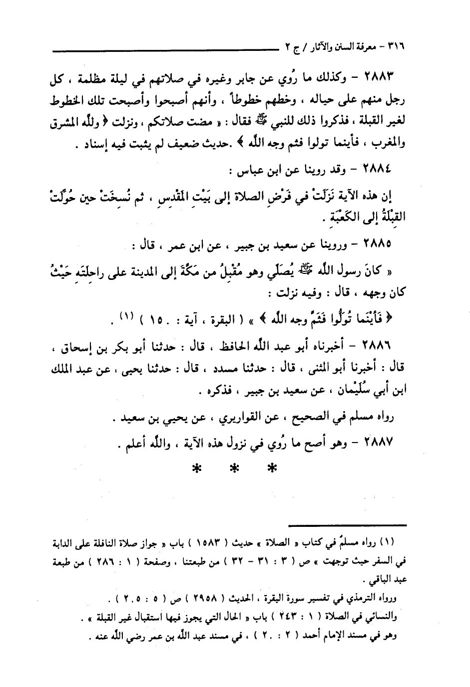 2885 - وَرُوِّينَا عَنْ سَعِيدِ بْنِ جُبَيْرٍ، عَنِ ابْنِ عُمَرَ قَالَ: " كَانَ رَسُولُ اللَّهِ صَلَّى اللهُ عَلَيْهِ وَسَلَّمَ §يُصَلِّي، وَهُوَ مُقْبِلٌ مِنْ مَكَّةَ إِلَى الْمَدِينَةِ عَلَى رَاحِلَتِهِ حَيْثُ كَانَ وَجْهُهُ قَالَ: وَفِيهِ نَزَلَتْ: {فَأَيْنَمَا تُوَلُّوا فَثَمَّ وَجْهُ اللَّهِ} [البقرة: 115] "