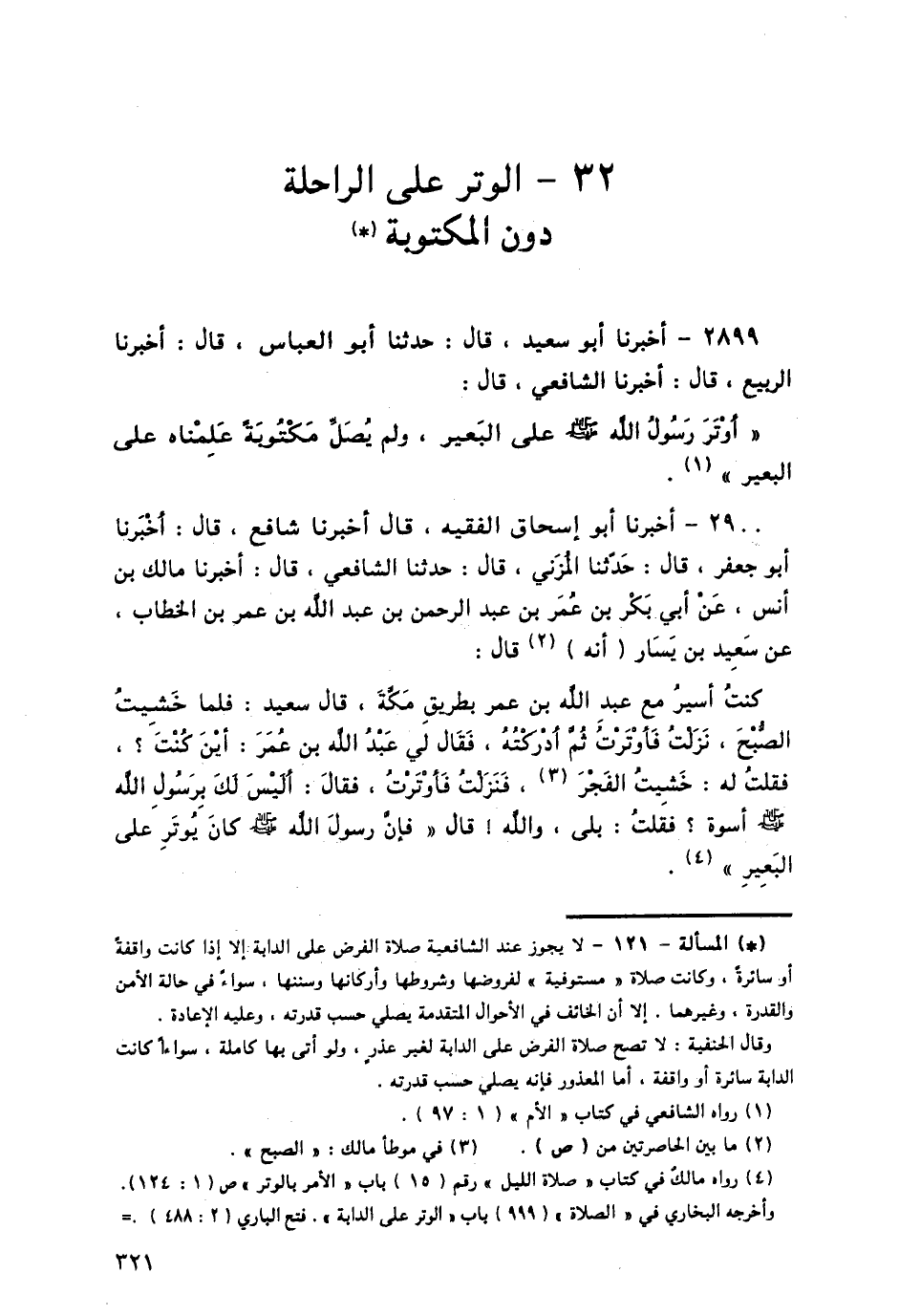 2900 - أَخْبَرَنَا أَبُو إِسْحَاقَ الْفَقِيهُ قَالَ أَخْبَرَنَا شَافِعٌ قَالَ: أَخْبَرَنَا أَبُو جَعْفَرٍ قَالَ: حَدَّثَنَا الْمُزَنِيُّ قَالَ: حَدَّثَنَا الشَّافِعِيُّ قَالَ: أَخْبَرَنَا مَالِكُ بْنُ أَنَسٍ، عَنْ أَبِي بَكْرِ بْنِ عُمَرَ بْنِ عَبْدِ الرَّحْمَنِ بْنِ عَبْدِ اللَّهِ بْنِ عُمَرَ بْنِ الْخَطَّابِ، عَنْ سَعِيدِ بْنِ يَسَارٍ، أَنَّهُ قَالَ: كُنْتُ أَسِيرُ مَعَ عَبْدِ اللَّهِ بْنِ عُمَرَ بِطَرِيقِ مَكَّةَ قَالَ سَعِيدٌ: فَلَمَّا خَشِيتُ الصُّبْحَ، نَزَلْتُ فَأَوْتَرْتُ ثُمَّ أَدْرَكْتُهُ، فَقَالَ لِي عَبْدُ اللَّهِ بْنُ عُمَرَ: أَيْنَ كُنْتَ؟ فَقُلْتُ لَهُ: خَشِيتُ الْفَجْرَ، فَنَزَلْتُ فَأَوْتَرْتُ، فَقَالَ أَلَيْسَ لَكَ بِرَسُولِ اللَّهِ صَلَّى اللهُ عَلَيْهِ وَسَلَّمَ أُسْوَةٌ؟ فَقُلْتُ: بَلَى، وَاللَّهِ قَالَ: «فَإِنَّ رَسُولَ اللَّهِ صَلَّى اللهُ عَلَيْهِ وَسَلَّمَ، كَانَ §يُوتِرُ عَلَى الْبَعِيرِ» -[322]- رَوَاهُ الزَّعْفَرَانِيُّ، عَنِ الشَّافِعِيِّ فِي الْقَدِيمِ بِمَعْنَاهُ. رَوَاهُ الْبُخَارِيُّ فِي الصَّحِيحِ، عَنِ ابْنِ أَبِي أُوَيْسٍ وَرَوَاهُ مُسْلِمٌ، عَنْ يَحْيَى بْنِ يَحْيَى، كِلَاهُمَا عَنْ مَالِكٍ.
